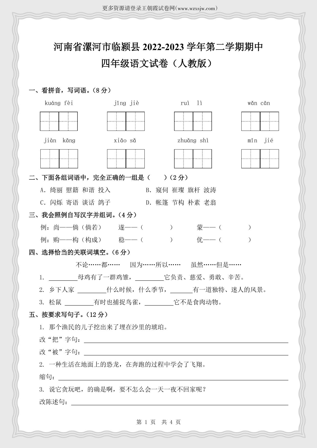 河南省漯河市临颍县2022-2023学年第二学期四年级语文期中试卷(人教版)