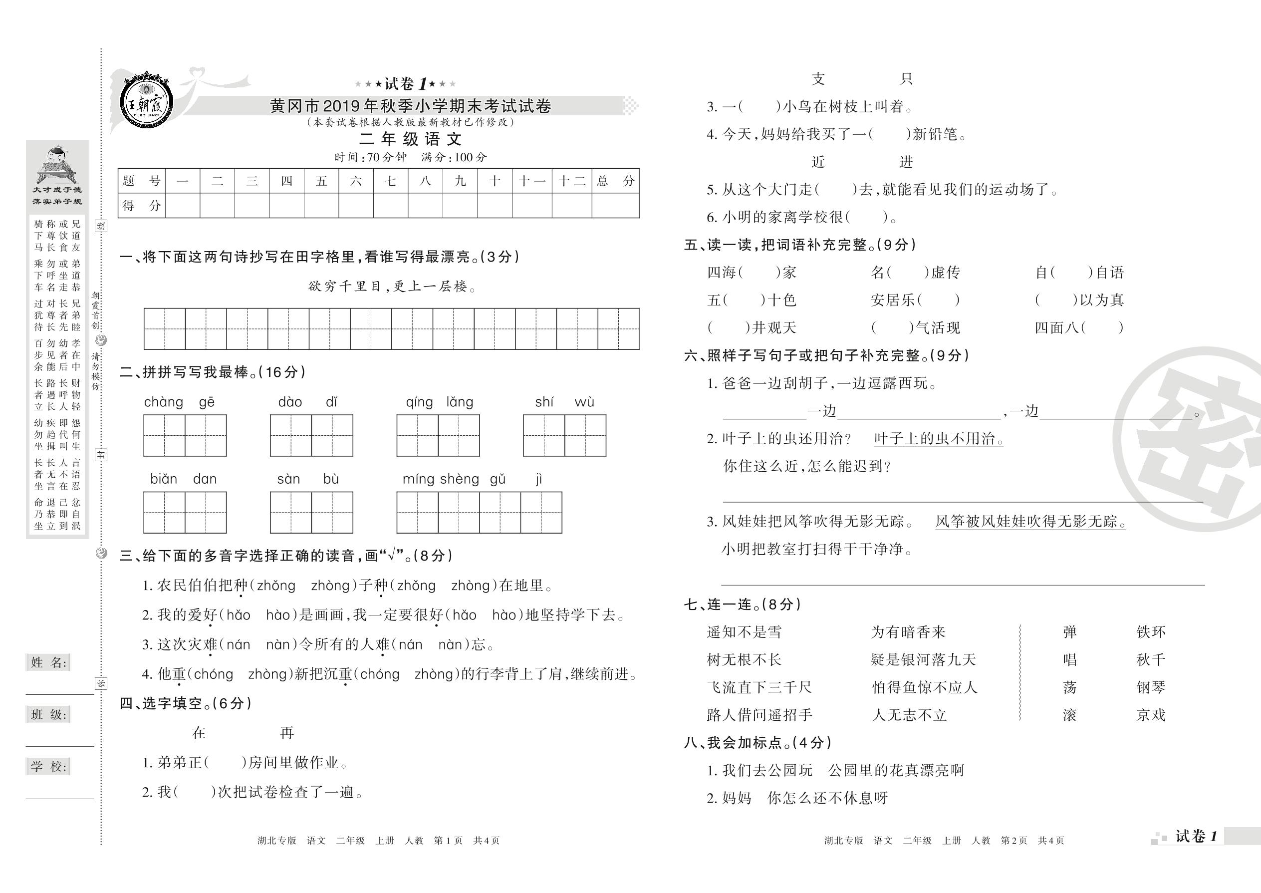 2019-2020学年第一学期黄冈市二年级语文试卷(人教版)【1】