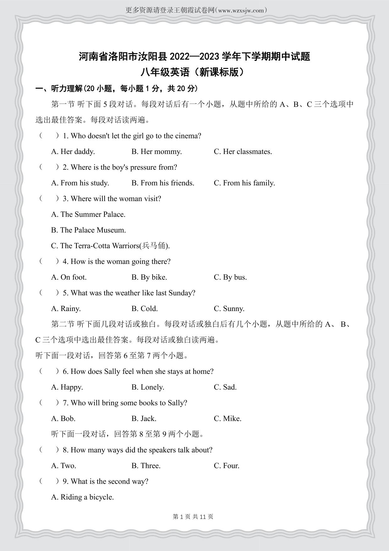 河南省洛阳市汝阳县2022—2023学年下学期期中试题八年级英语(新课标版)【无听力音频】