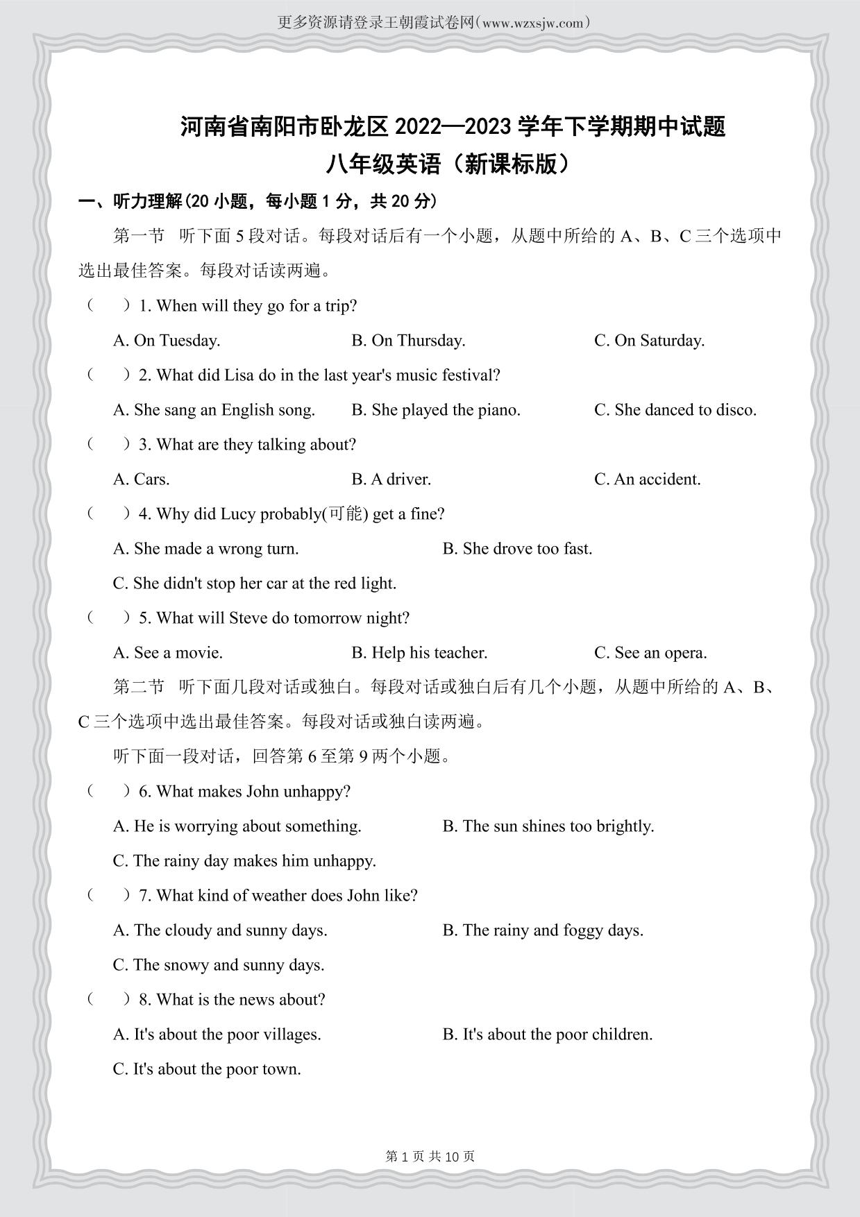 河南省南阳市卧龙区2022—2023学年下学期期中试题八年级英语(新课标版)【无听力音频】