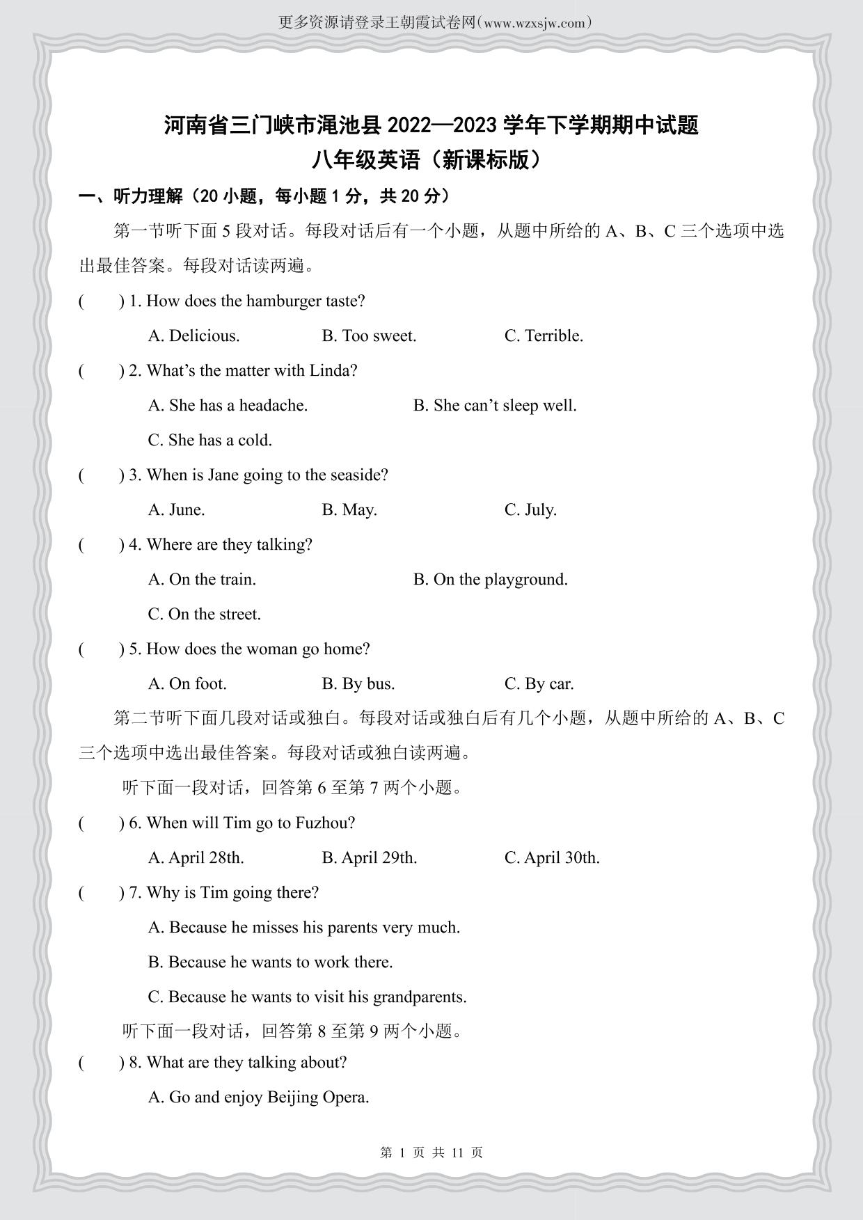 河南省三门峡市渑池县2022—2023学年下学期期中试题八年级英语(新课标版)【无听力音频】