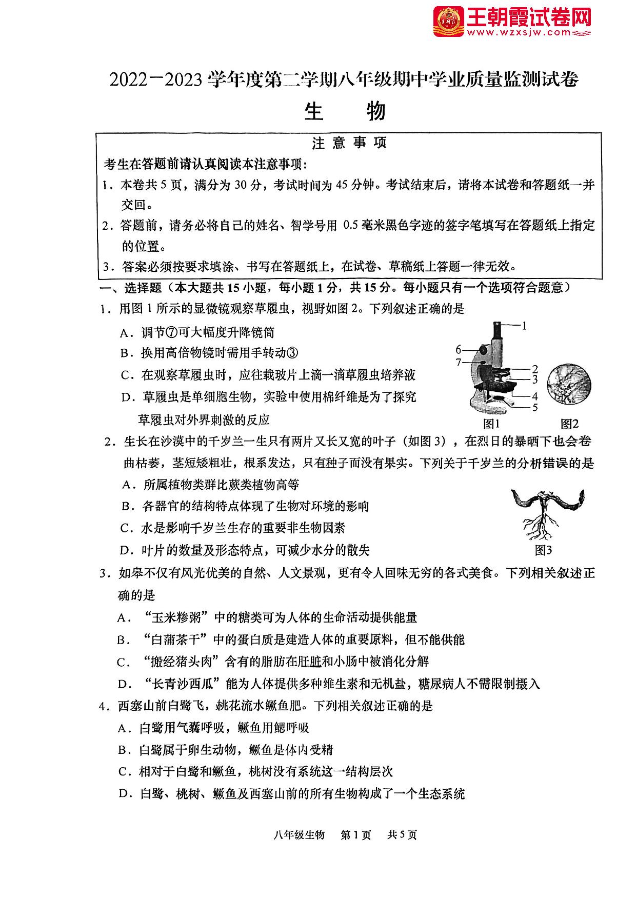 江苏省南通市如皋市2022-2023学年下学期期中考试试卷八年级生物(人教版)