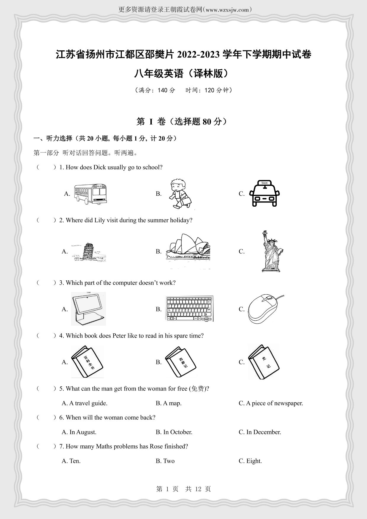 江苏省扬州市江都区邵樊片2022-2023学年下学期期中试卷八年级英语【无听力音频】(译林版)