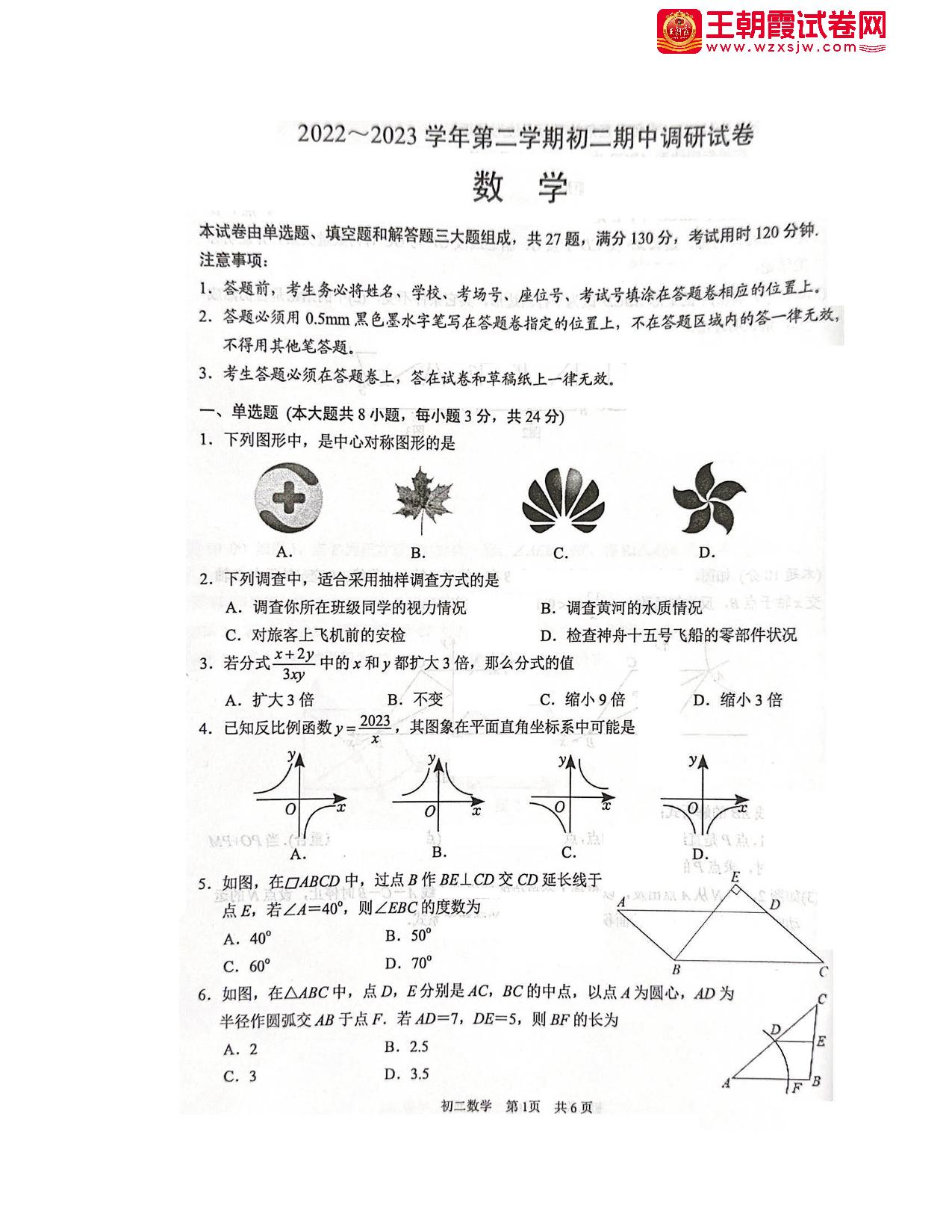 江苏省苏州市吴江区2022-2023学年下学期期中试题八年级数学(苏科版)