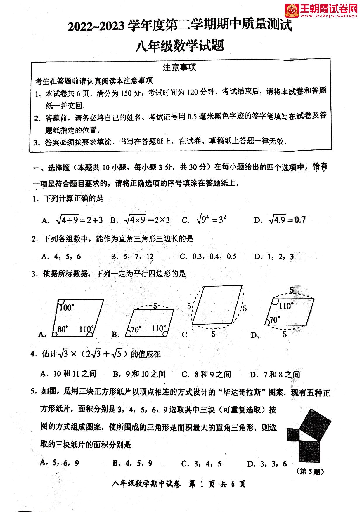 江苏省南通市启东市2022-2023学年下学期4月期中质量检测试题八年级数学(人教版)