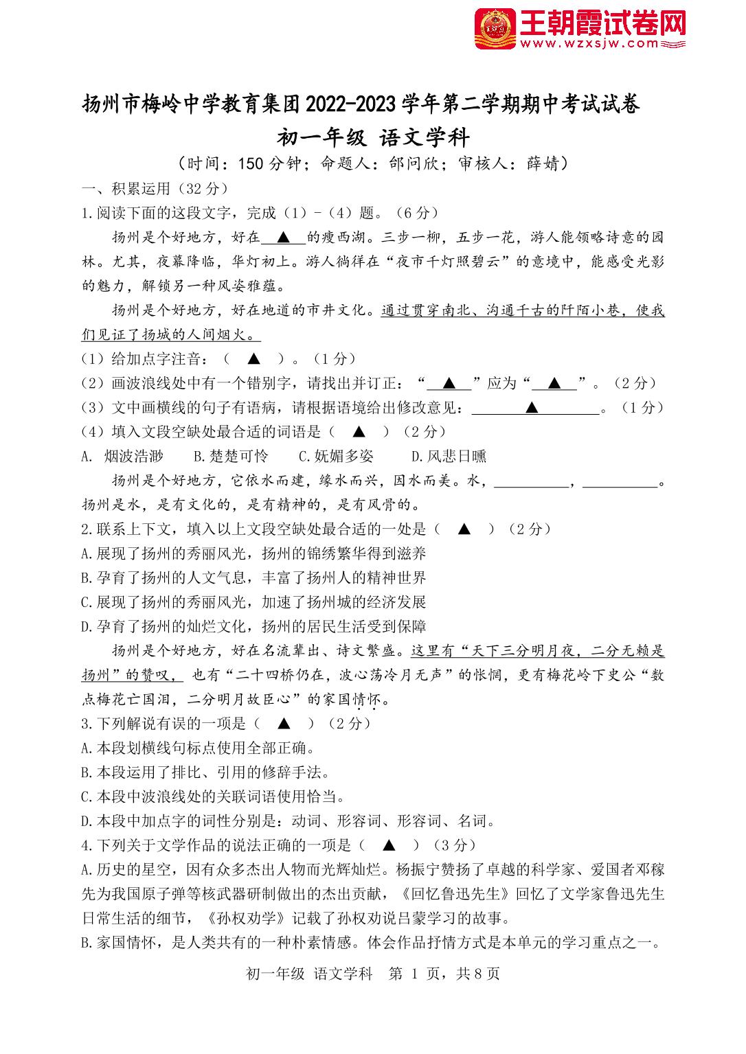 江苏省扬州市梅岭中学教育集团 2022-2023 学年第二学期期中考试试卷七年级语文(人教版)