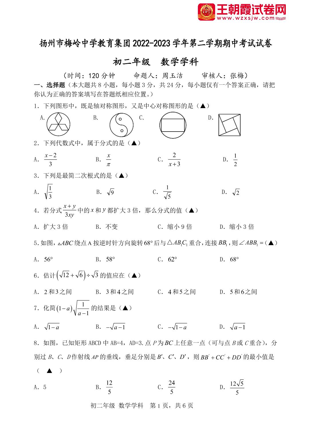 江苏省扬州市梅岭教育集团2022-2023学年下学期期中试卷八年级数学(苏科版)