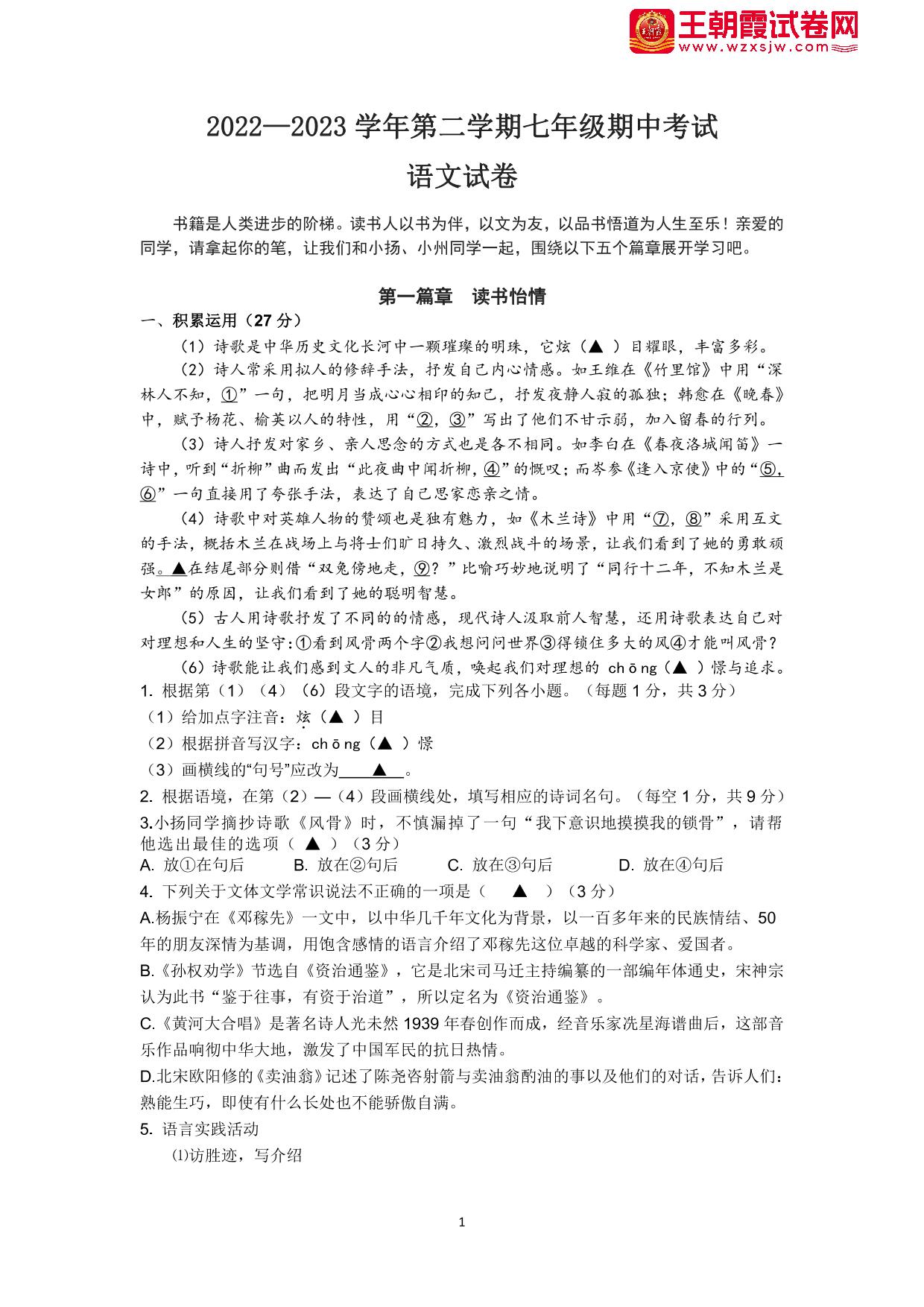 江苏省扬州市广陵区2022-2023学年下学期期中考试试题七年级语文(人教版)