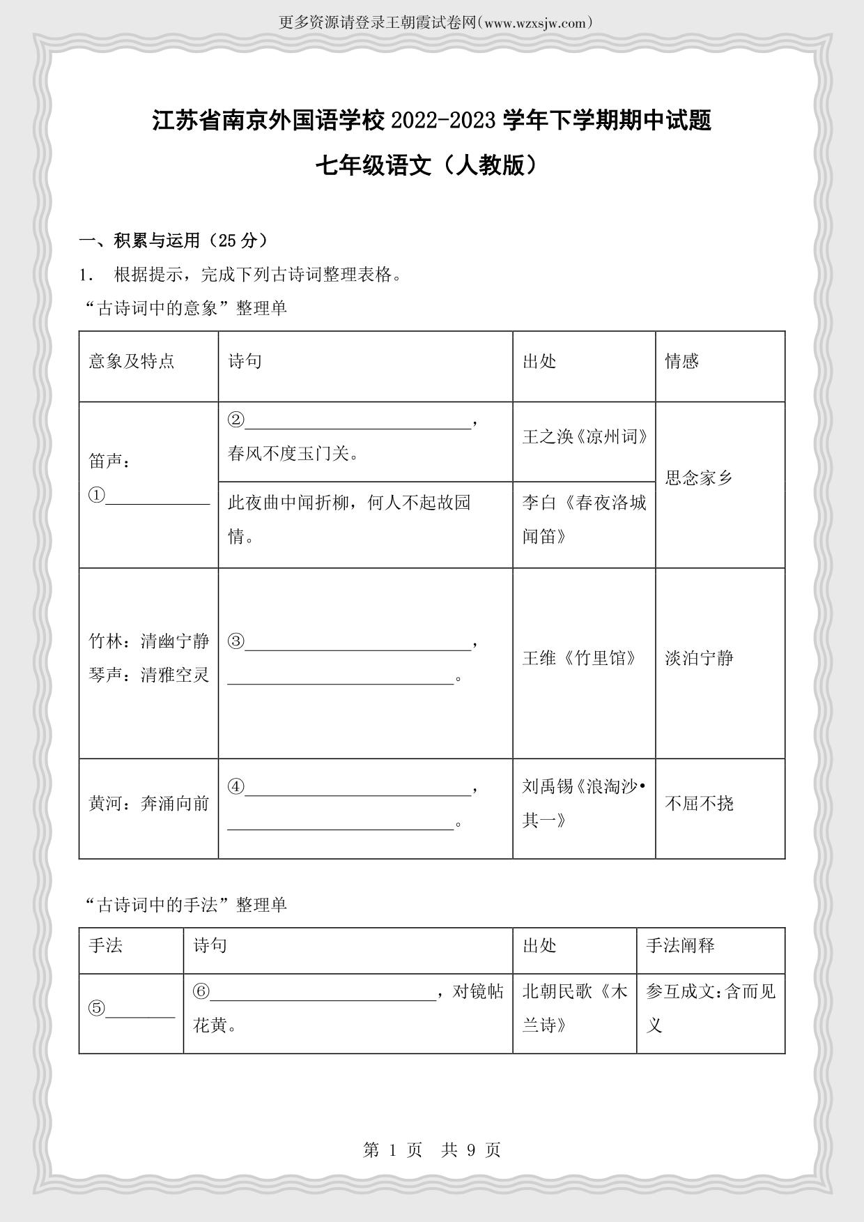 江苏省南京外国语学校2022-2023学年下学期期中试题七年级语文(人教版)
