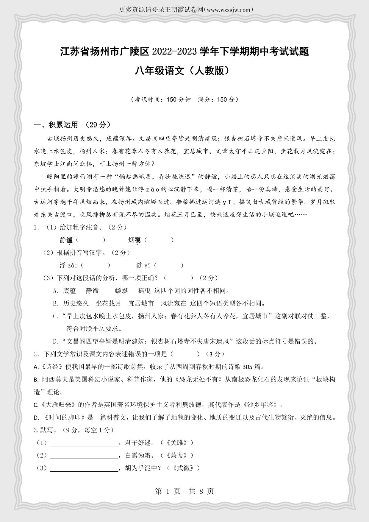 江苏省扬州市广陵区2022-2023学年下学期期中考试试题八年级语文(人教版)