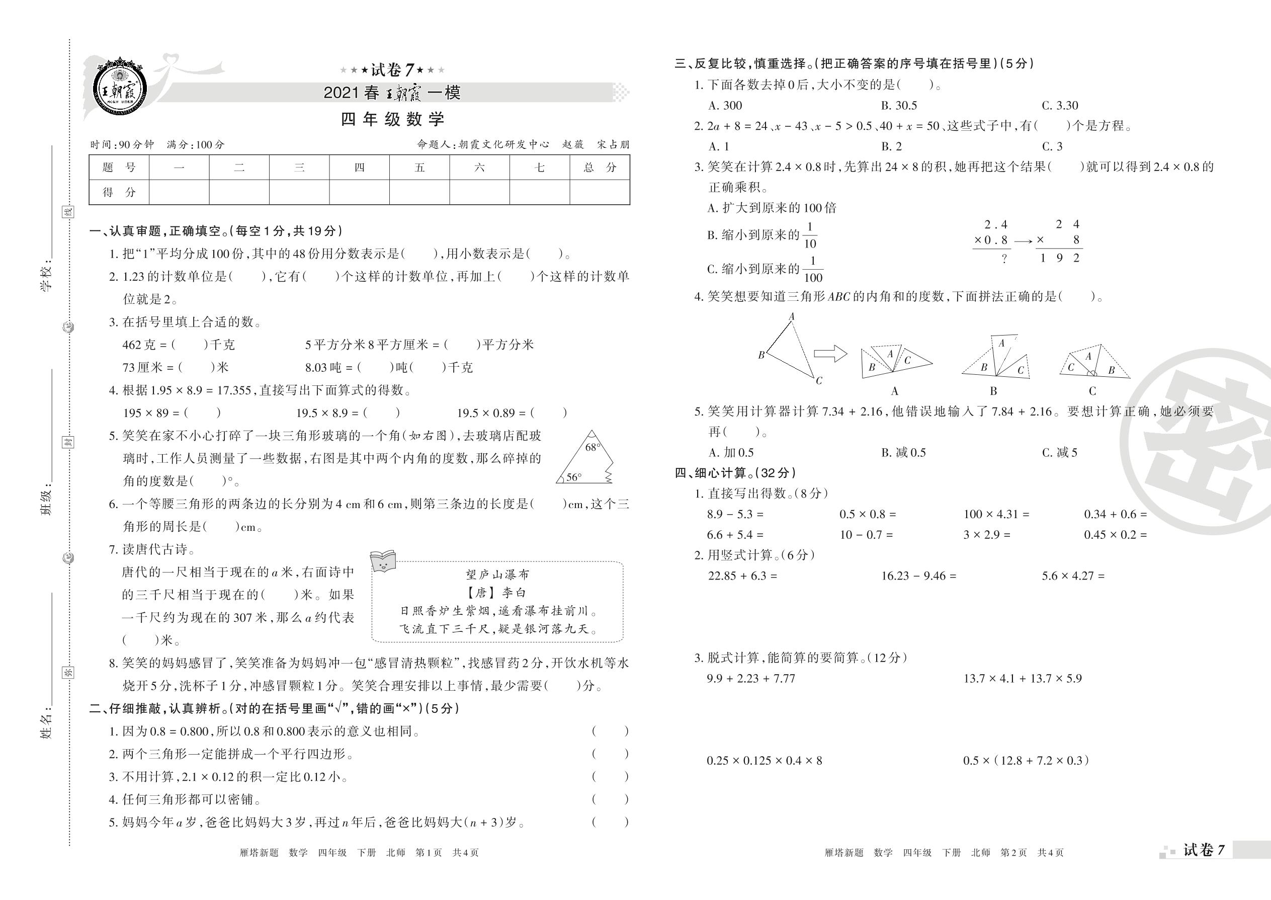 王朝霞期末模拟卷四年级下册数学(北师版)_R210804133855【7】