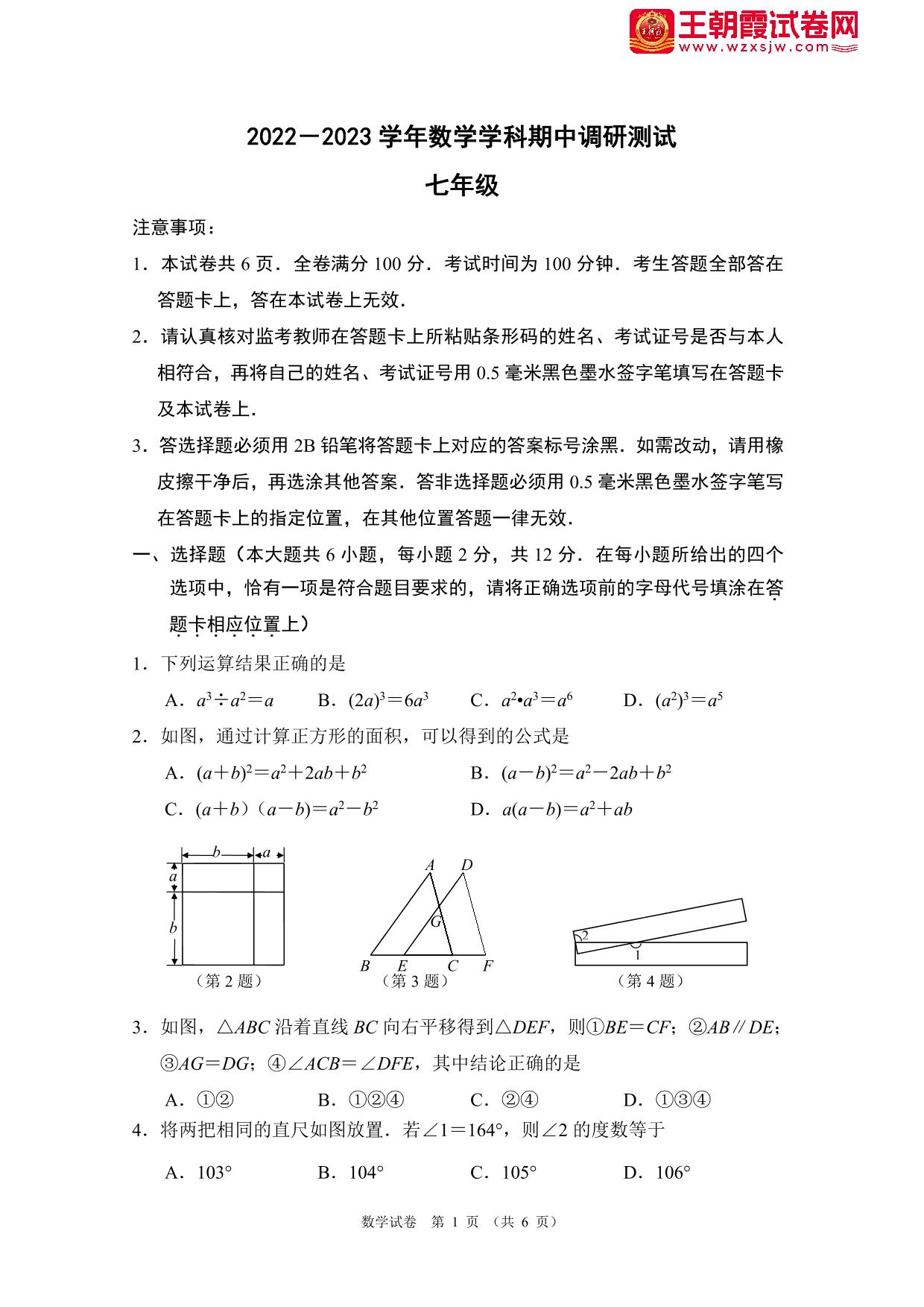 江苏省南京师范大学附属中学新城集团2022-2023学年下学期期中调研测试试卷七年级数学(苏科版)