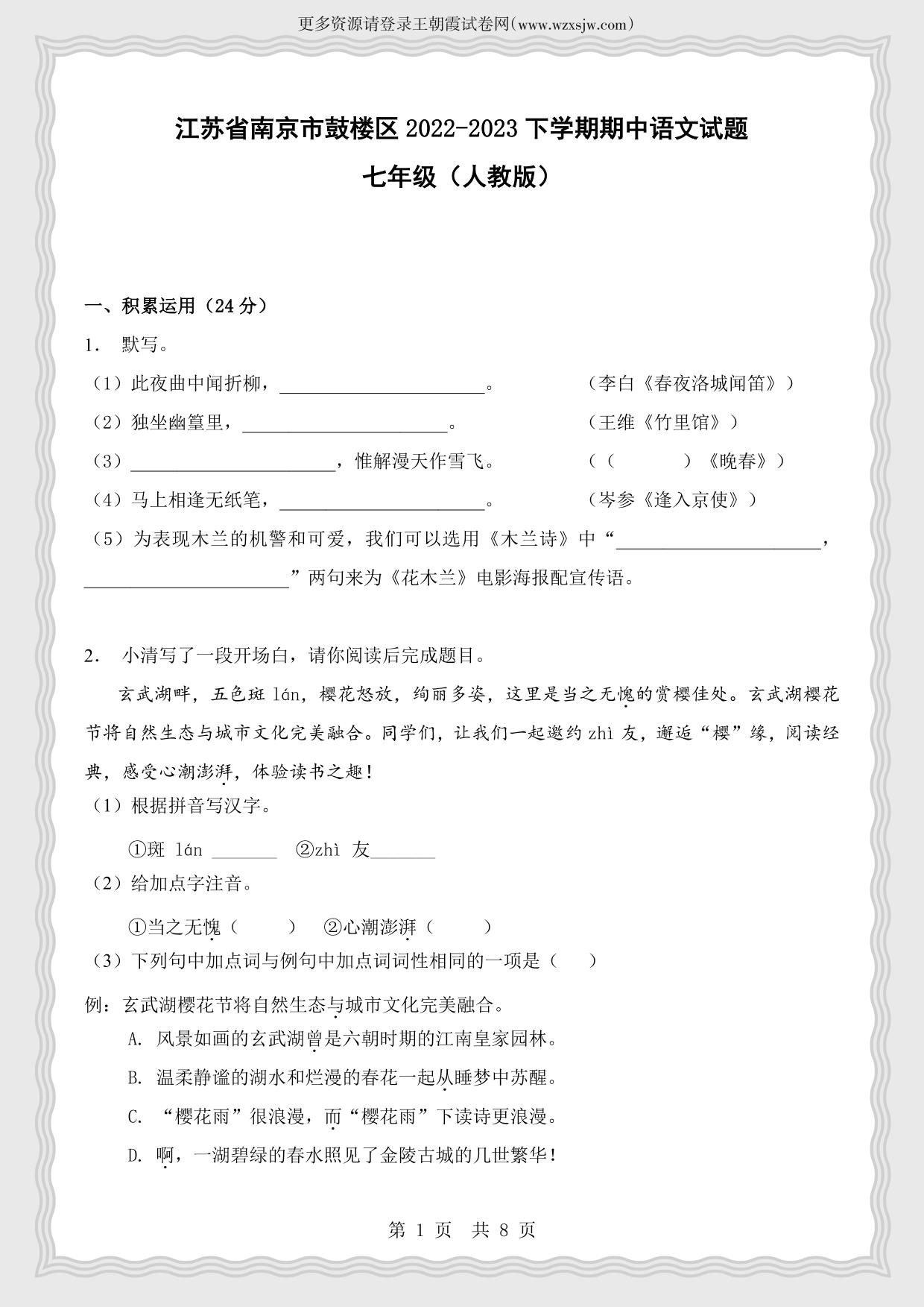 江苏省南京市鼓楼区2022-2023下学期期中语文试题七年级(人教版)