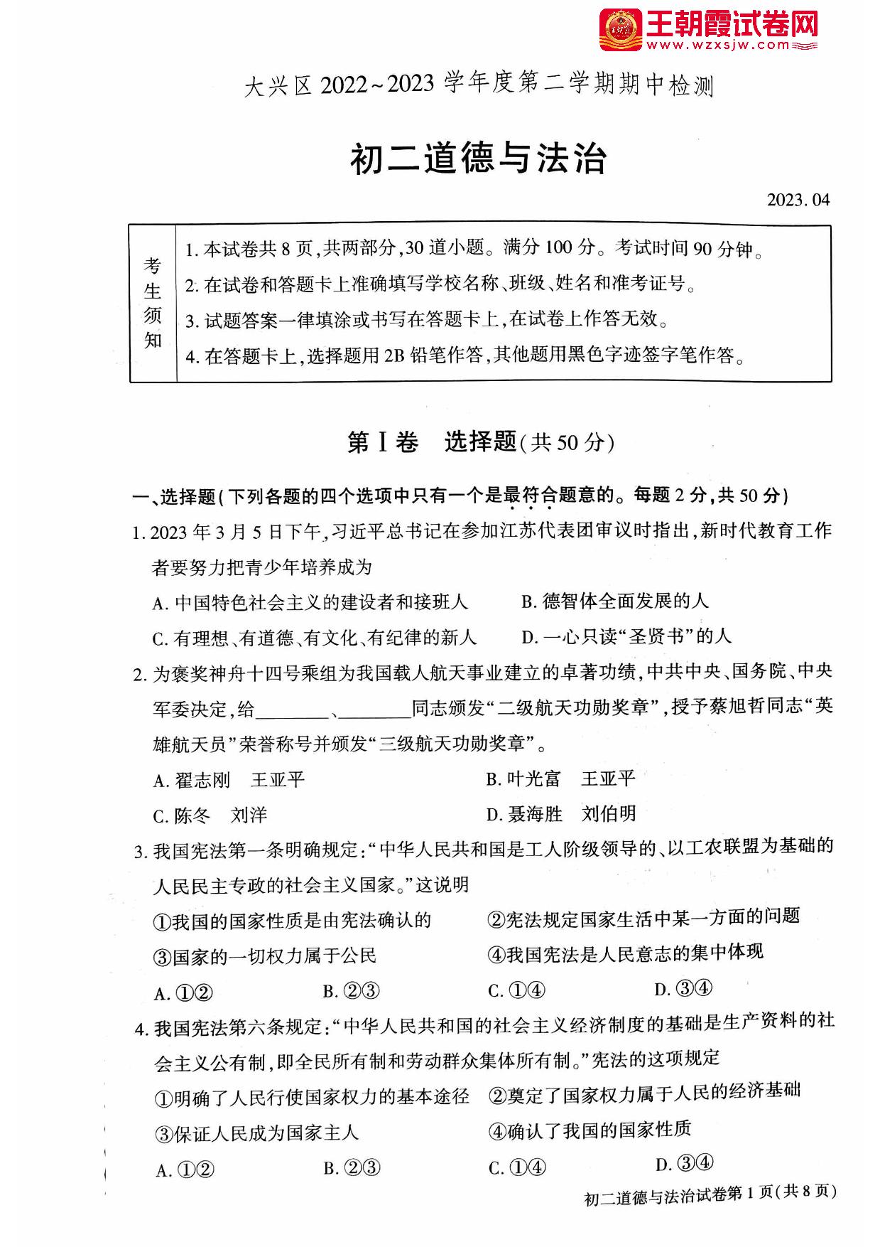 北京市大兴区2022-2023学年第二学期期中试卷八年级道法(人教版)