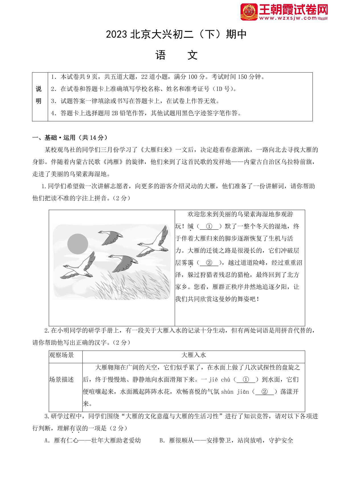 北京市大兴区2022-2023学年第二学期期中试卷八年级语文(人教版)