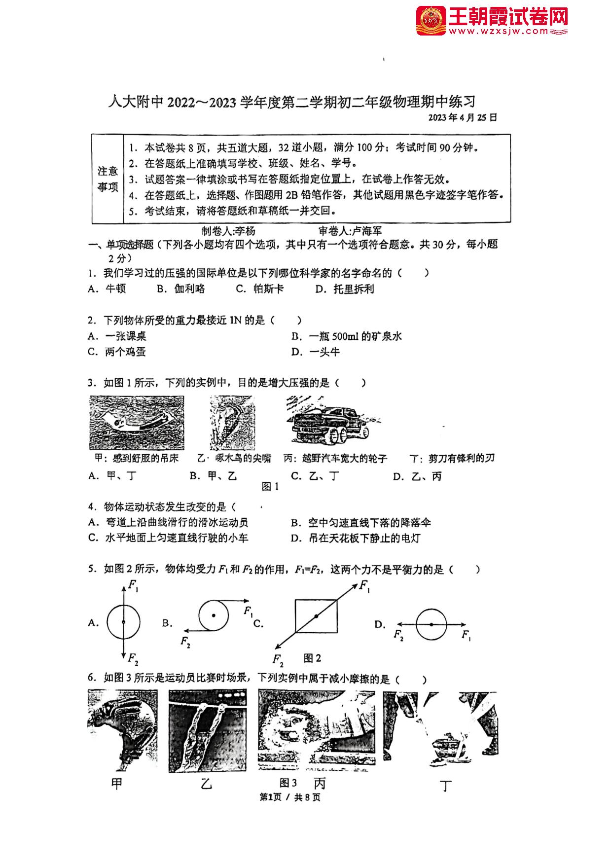 北京市海淀区人大附中2022-2023学年第二学期期中试卷八年级物理(人教版)