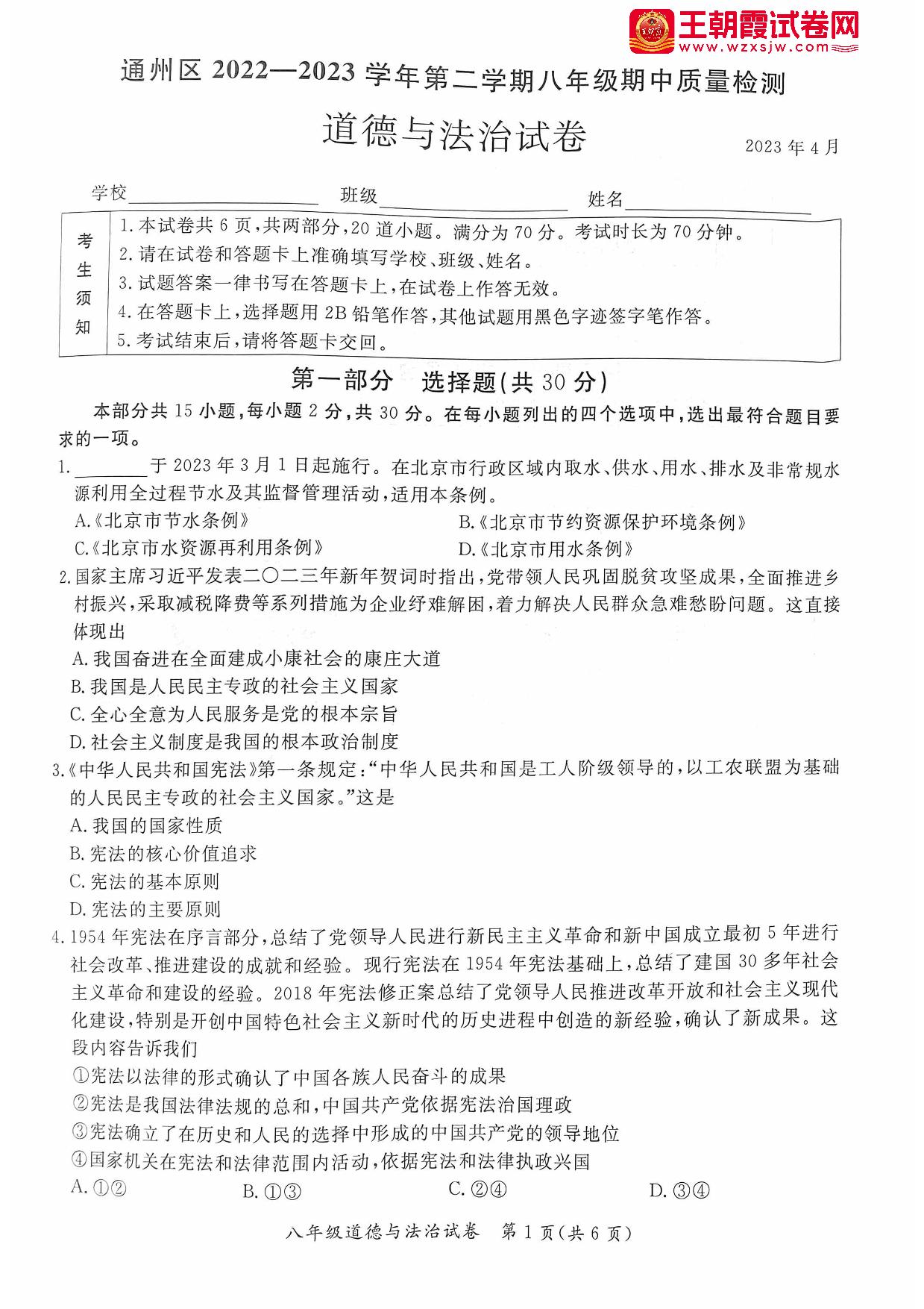 北京市通州区2022-2023学年第二学期期中试卷八年级道法(人教版)