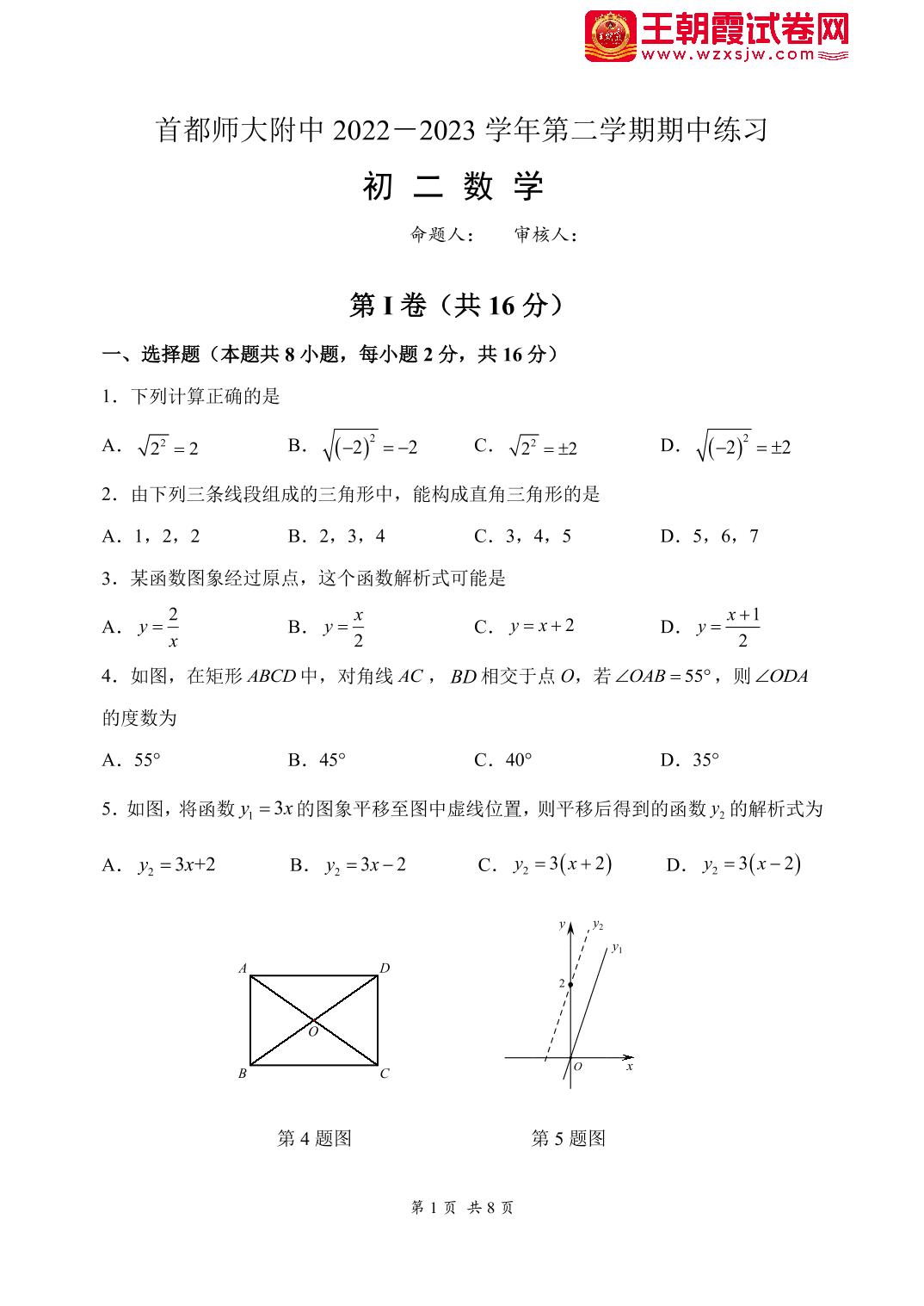 北京市海淀区首师大附中2022-2023学年第二学期期中试卷八年级数学(人教版)