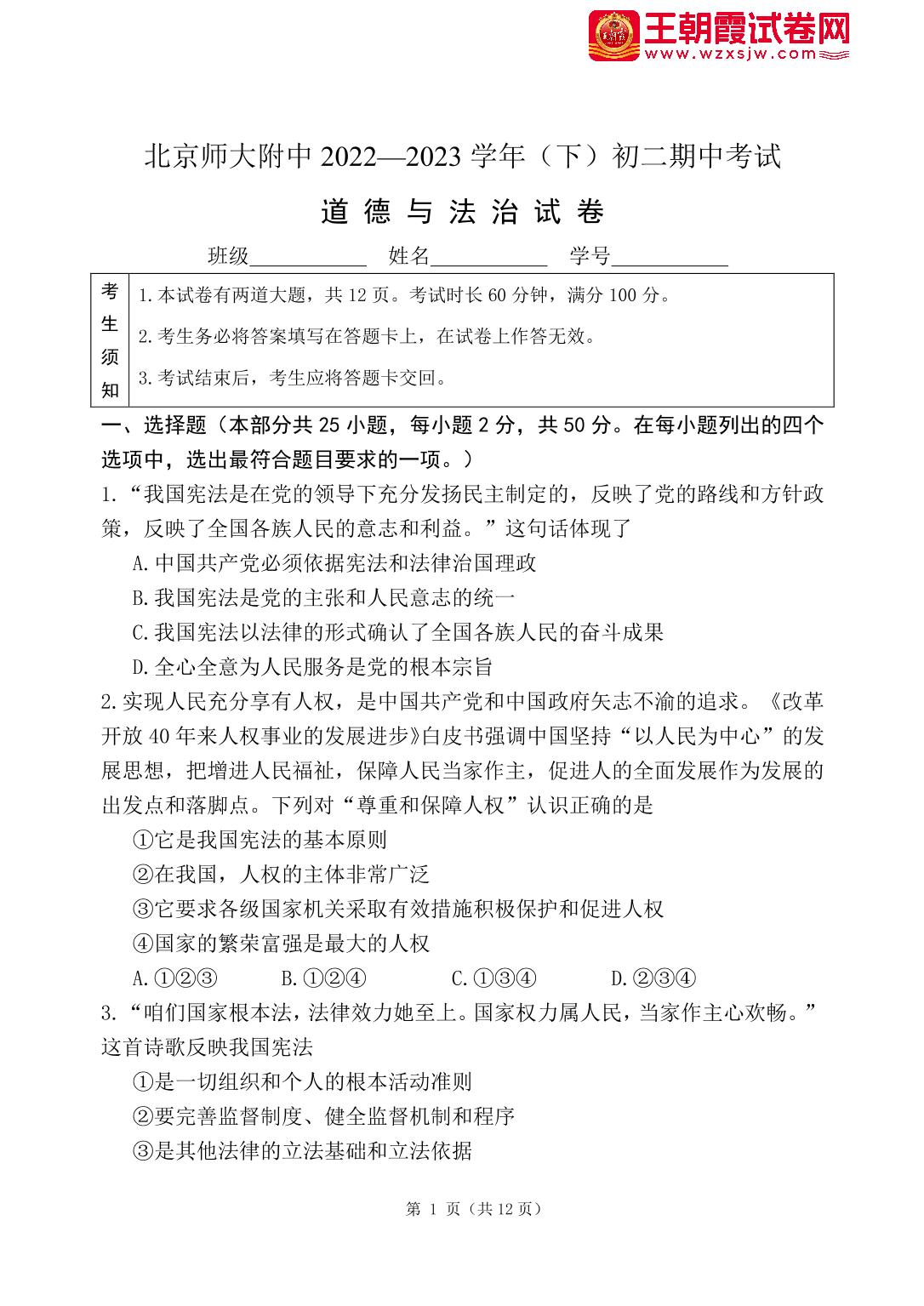 北京市西城区2022-2023学年第二学期北师大附中期中试卷八年级道法(人教版)
