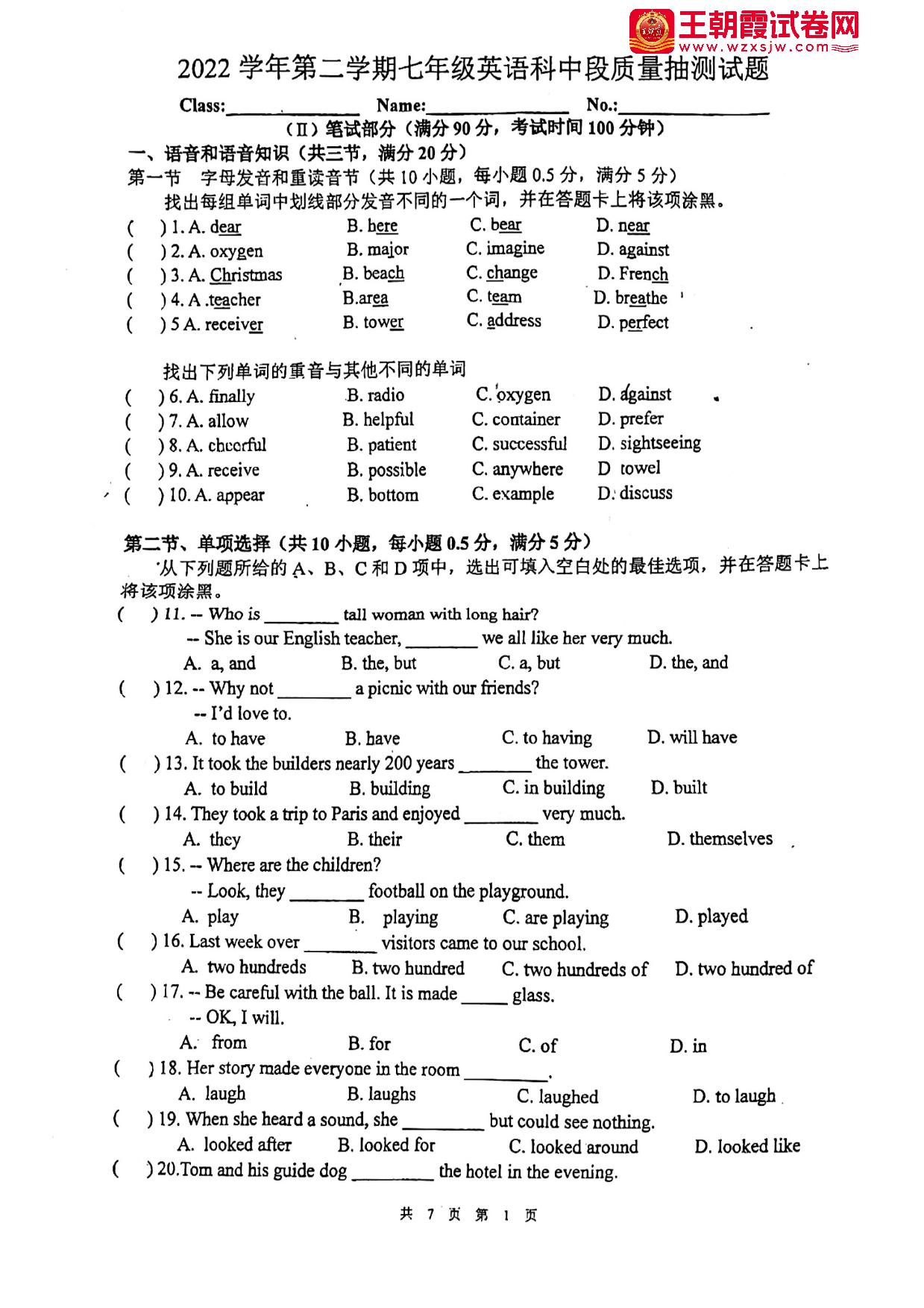广东省广州市番禺区钟村中学2022-2023学年下学期5月期中试题七年级英语(牛津深圳版)