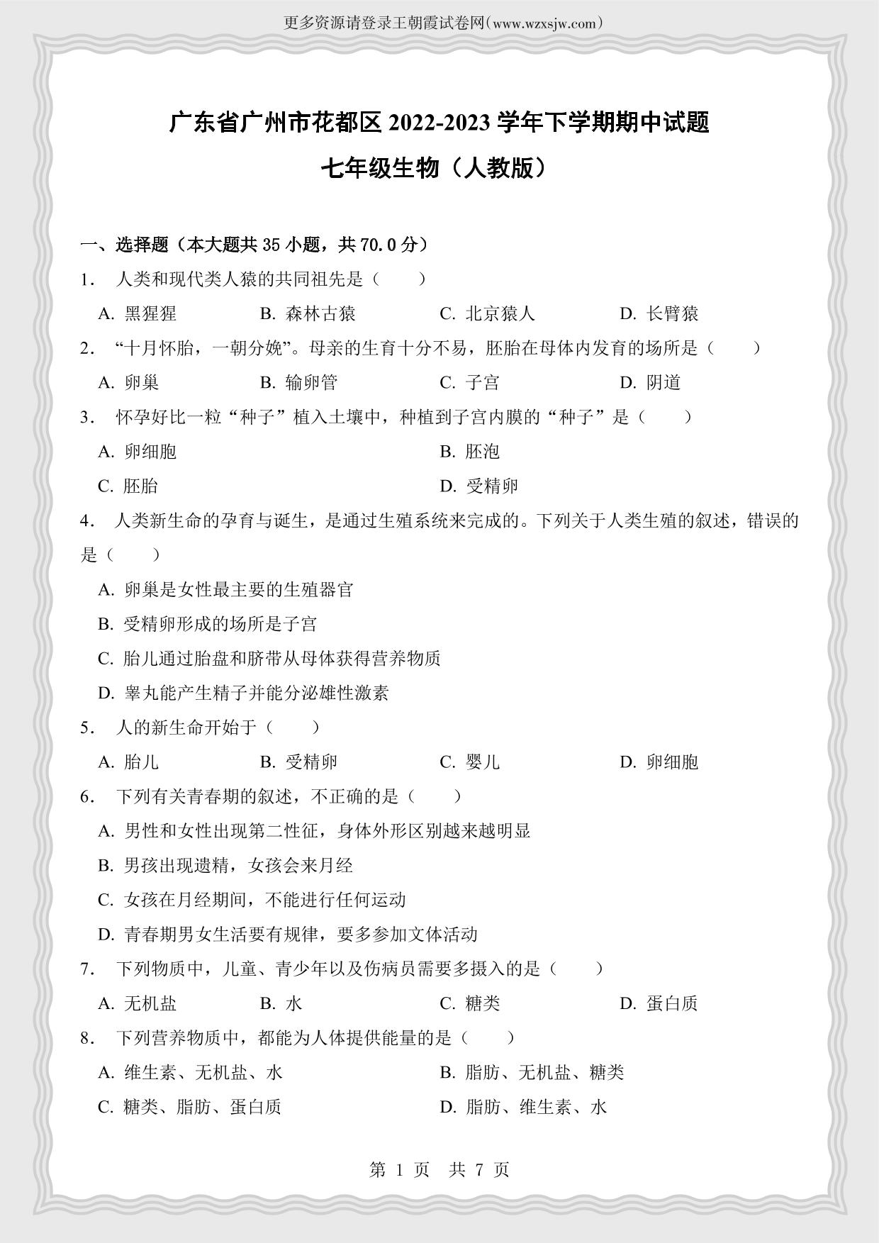 广东省广州市花都区2022-2023学年下学期期中试题七年级生物(人教版)