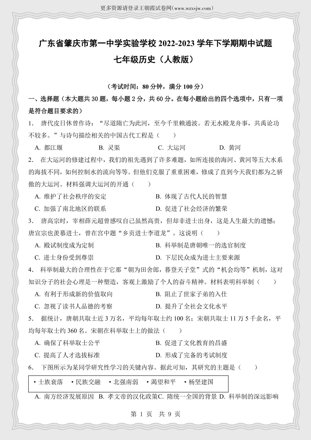 广东省肇庆市第一中学实验学校2022-2023学年下学期期中试题七年级历史(人教版)