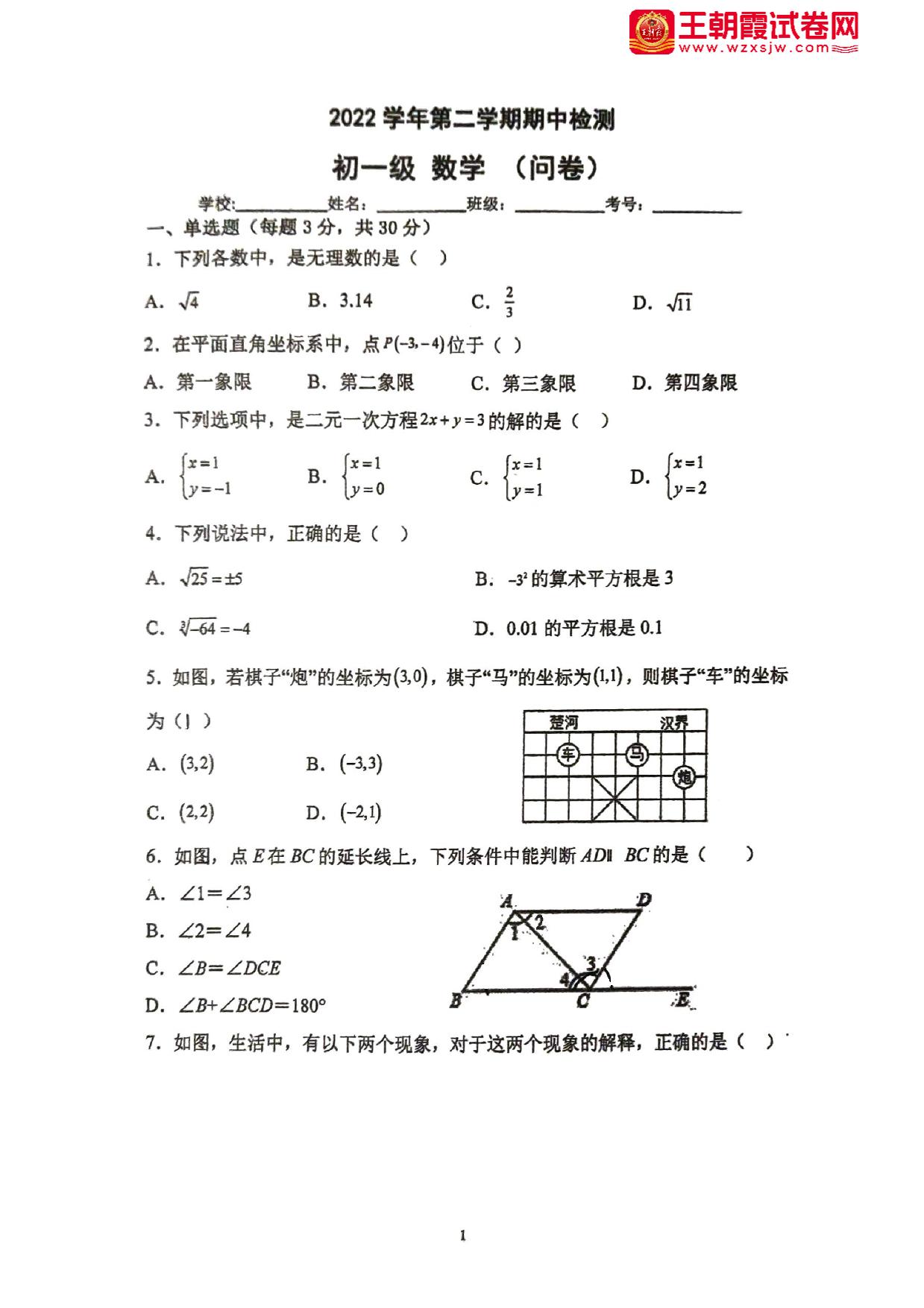 七年级数学人教版下册期中卷