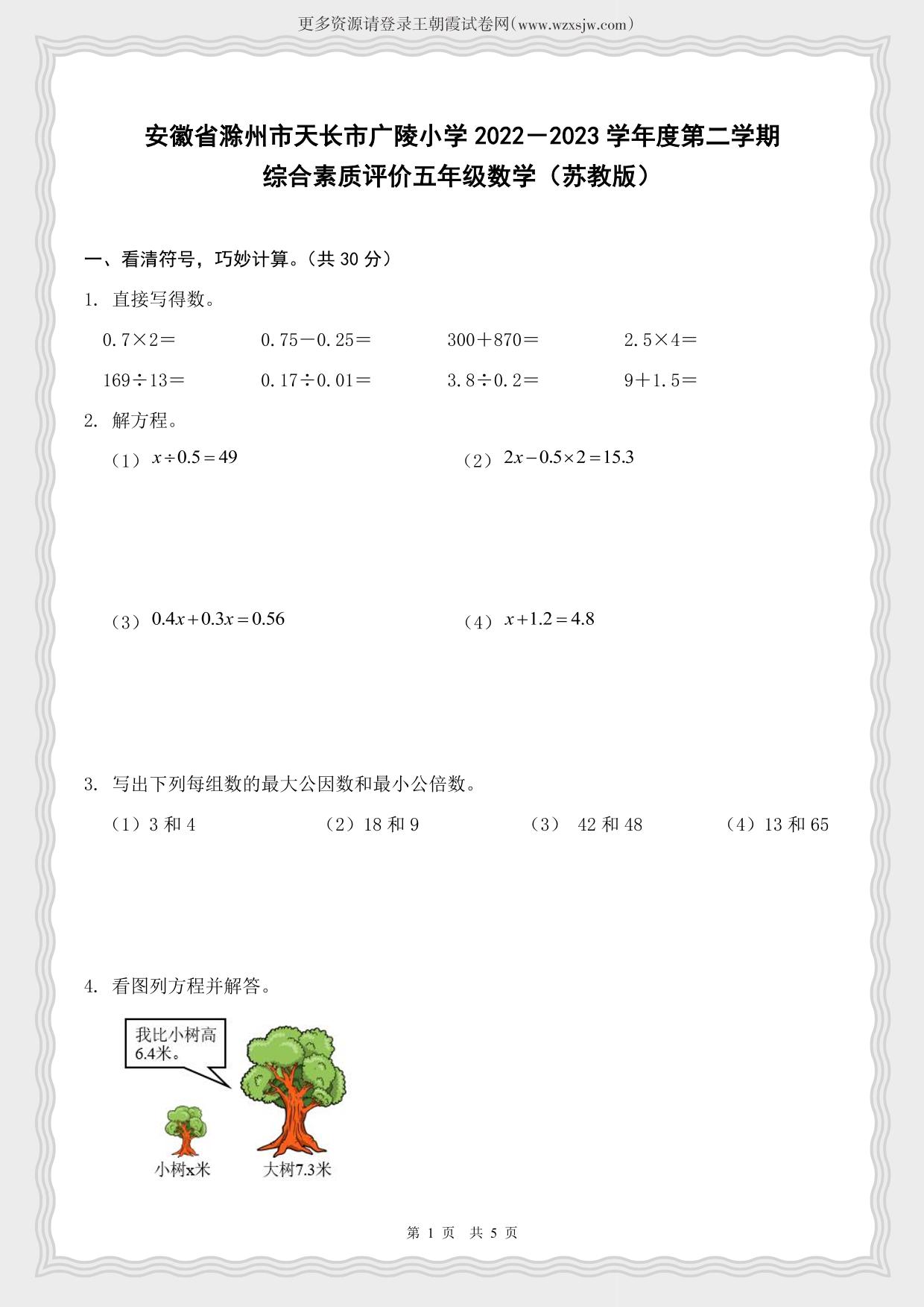 安徽省滁州市天长市广陵小学2022-2023学年度第二学期(期中)综合素质评价五年级数学(苏教版)