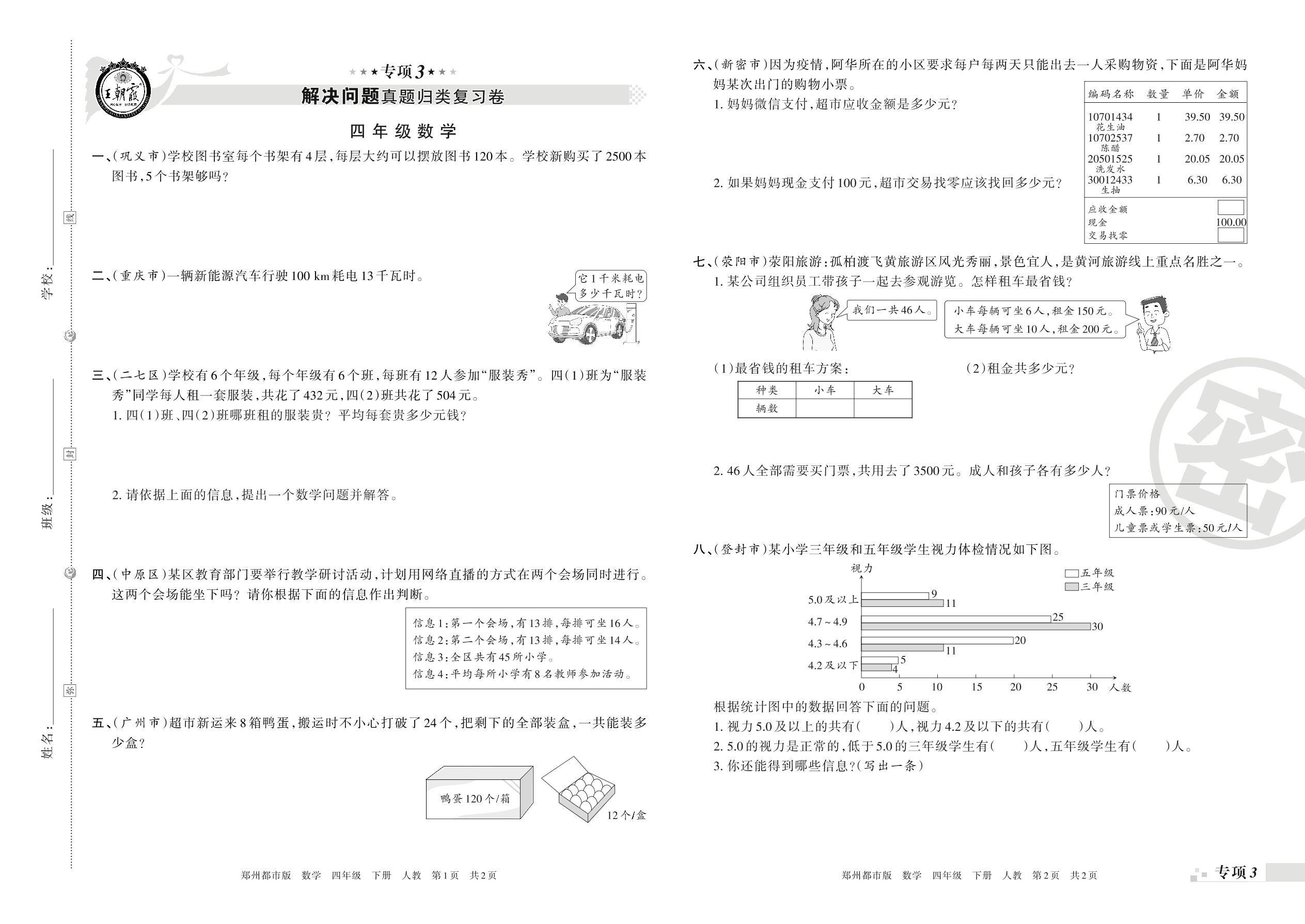 王朝霞期末专项卷——解决问题真题归类复习、新颖题速递:生活与数学四年级下册数学(人教版)_R210804133937【0】