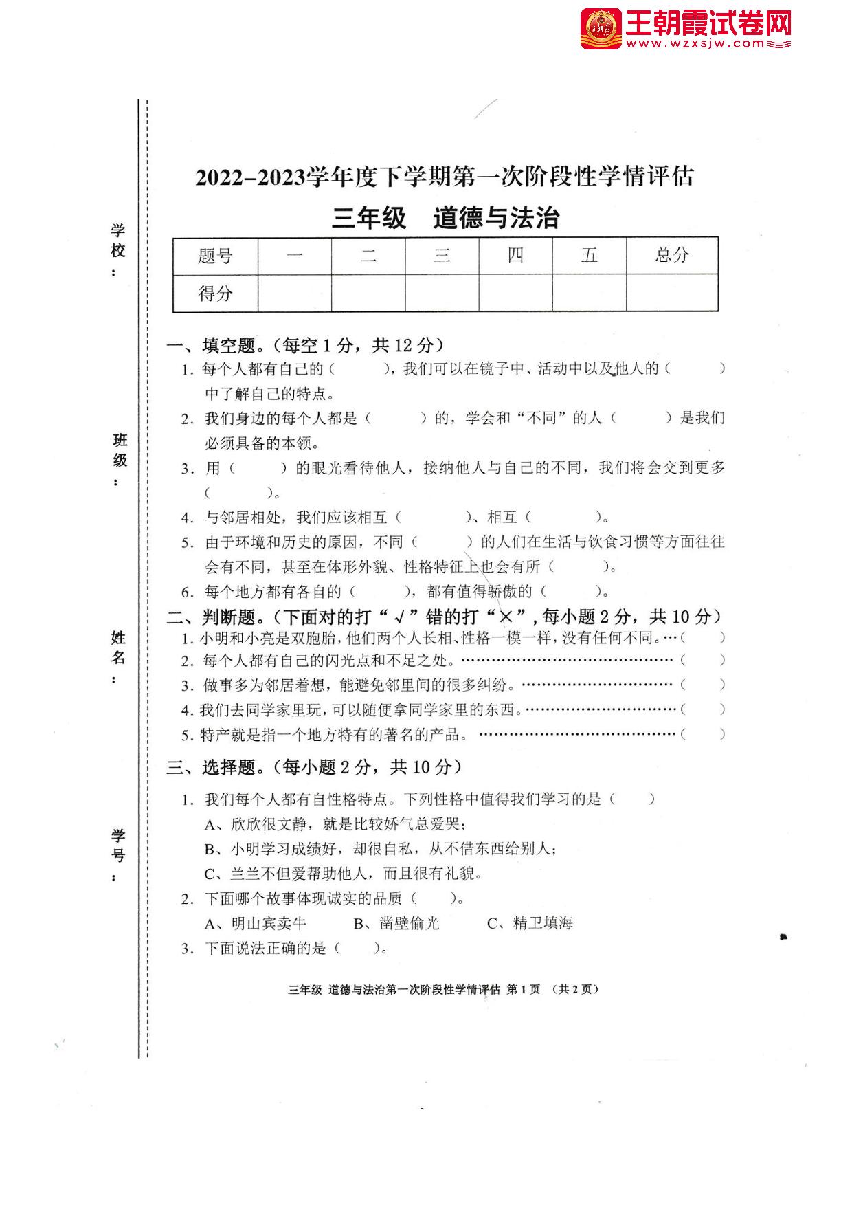 江西省九江市2022-2023学年度下学期第一次阶段性学情评估(期中)三年级道德与法(人教版)