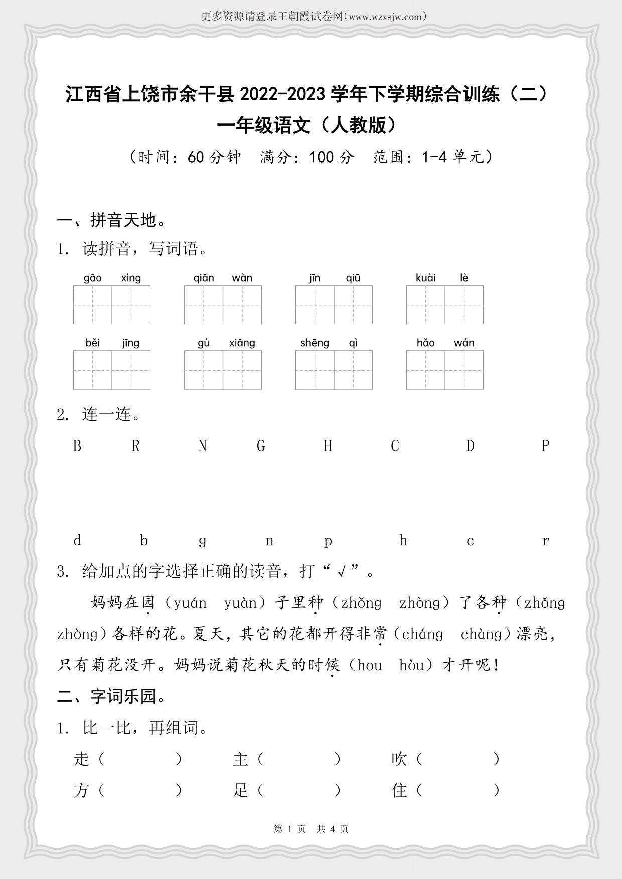 江西省上饶市余干县2022-2023学年下学期期中综合训练一年级语文(人教版)