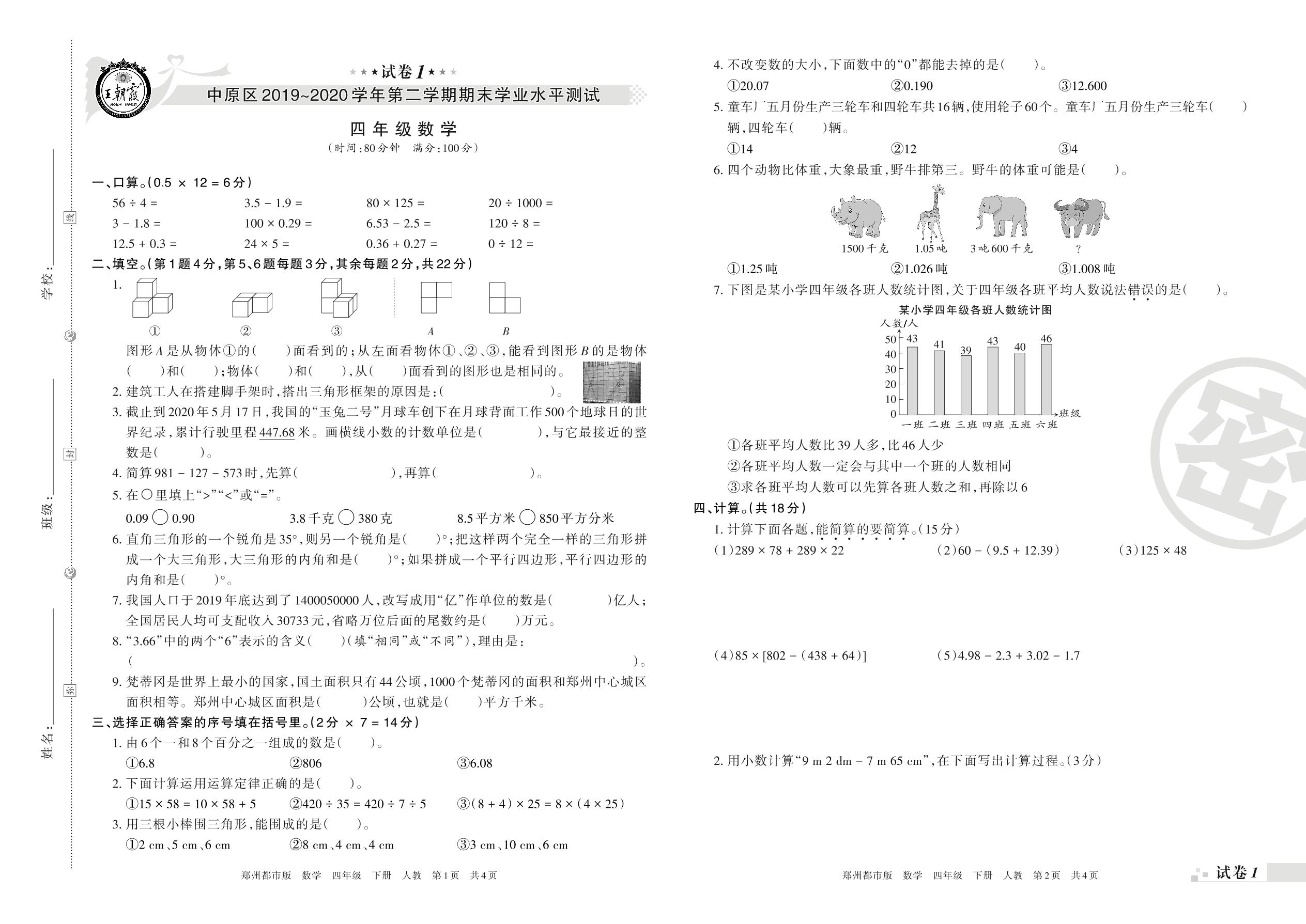 2019-2020学年第二学期郑州市中原区四年级数学试卷(人教版)_R210804133941【1】