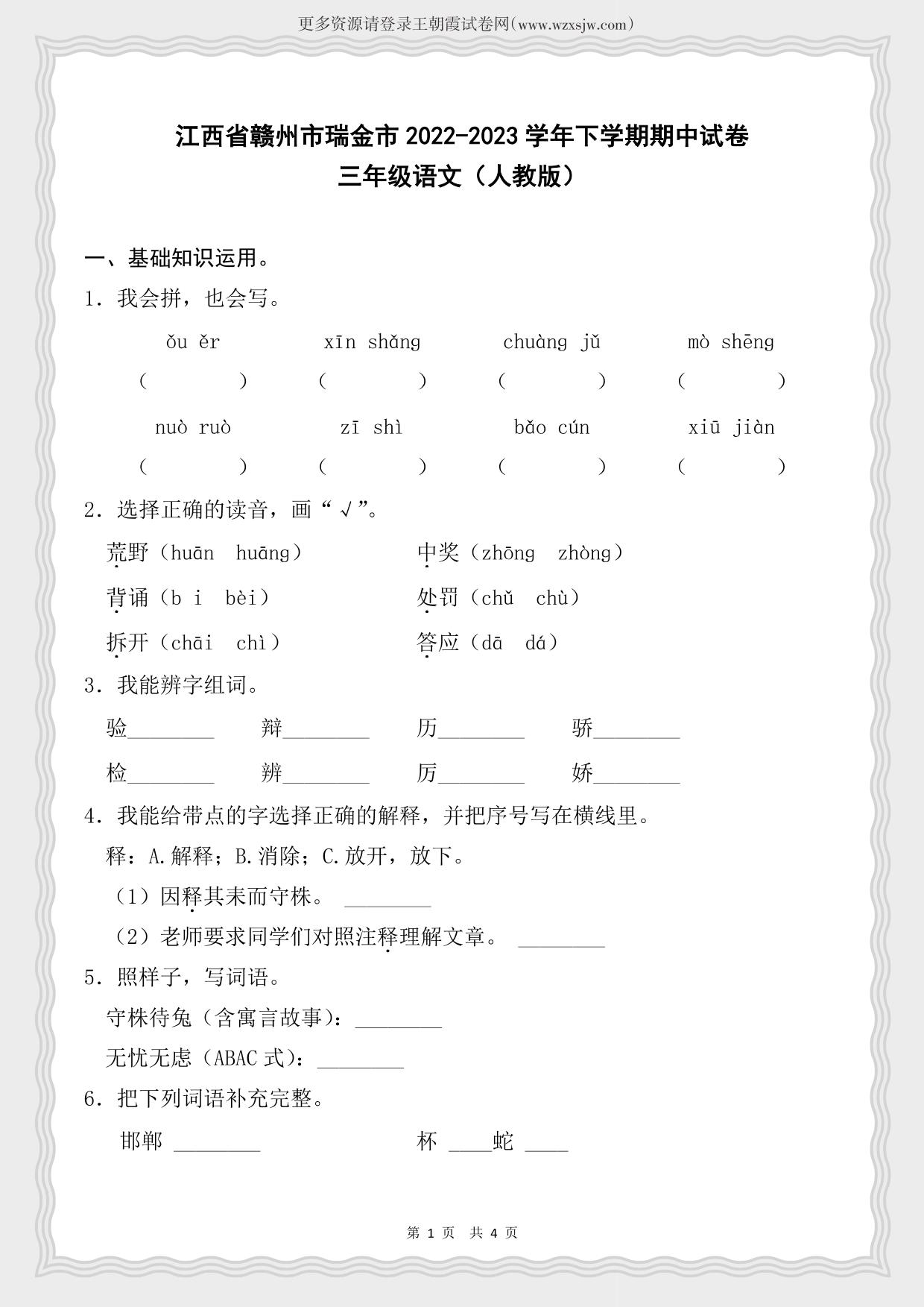 江西省赣州市瑞金市2022-2023学年下学期期中试卷三年级语文(人教版)
