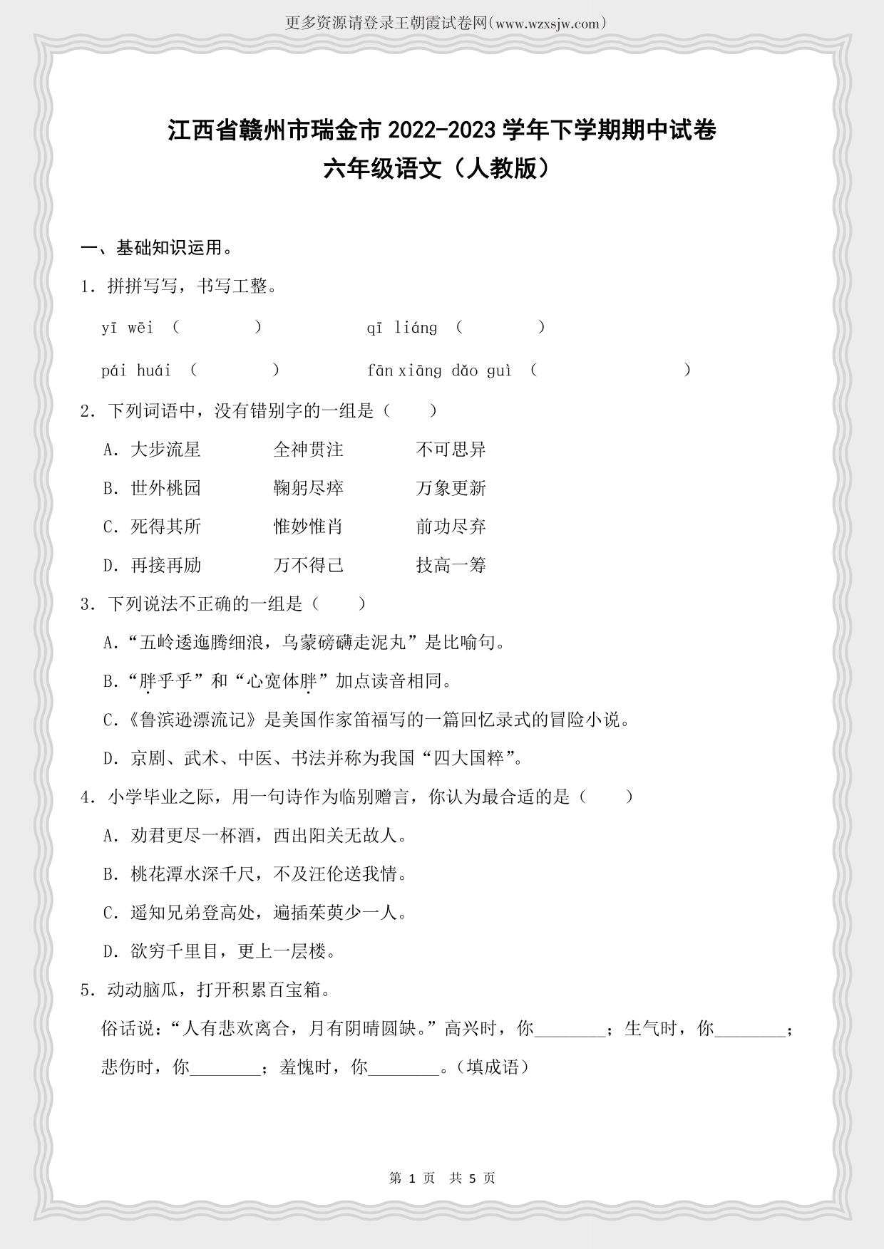 江西省赣州市瑞金市2022-2023学年下学期期中试卷六年级语文(人教版)