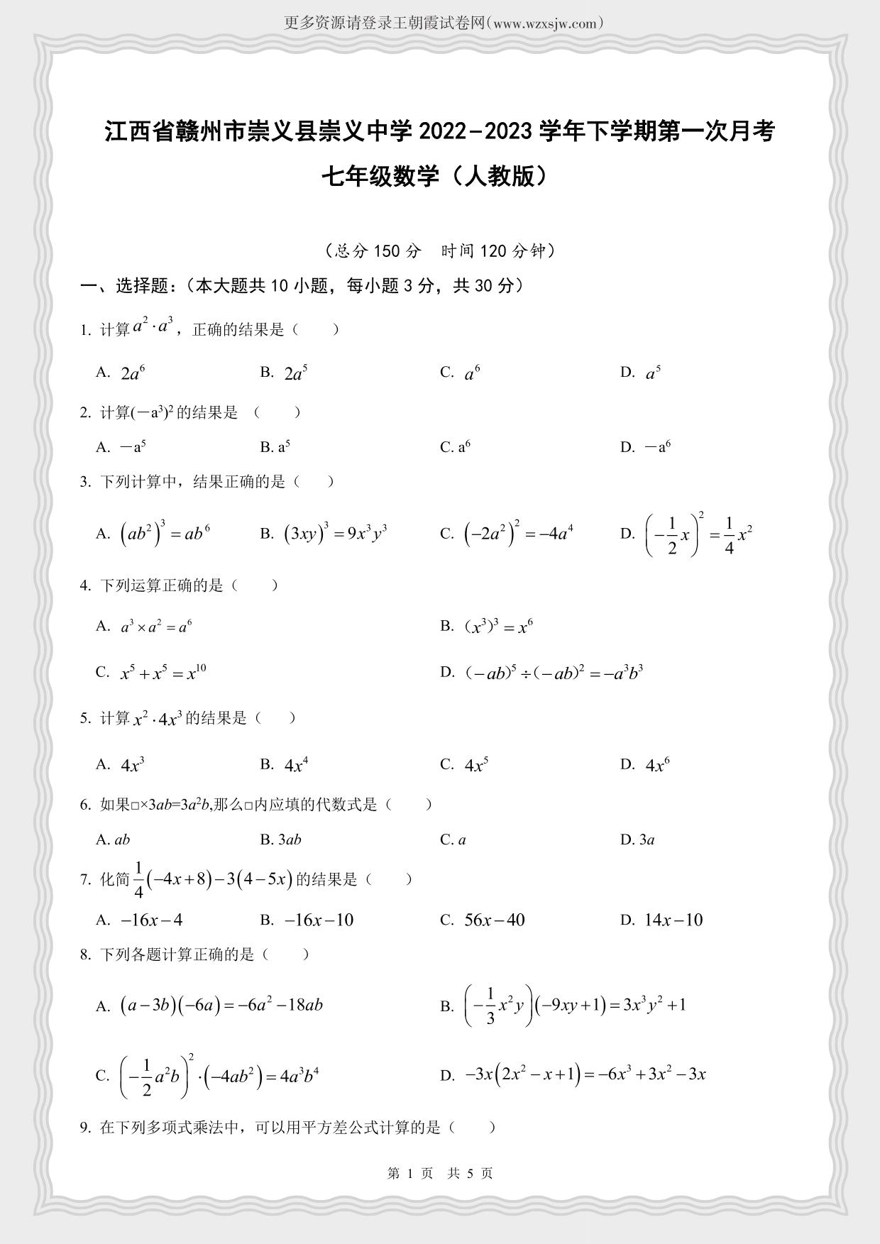 江西省赣州市崇义县崇义中学2022-2023学年下学期第一次月考七年级数学(人教版)