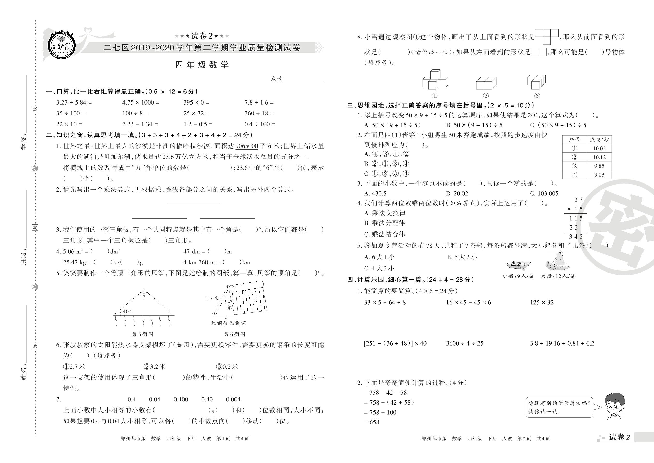 2019-2020学年第二学期郑州市二七区四年级数学试卷(人教版)【2】