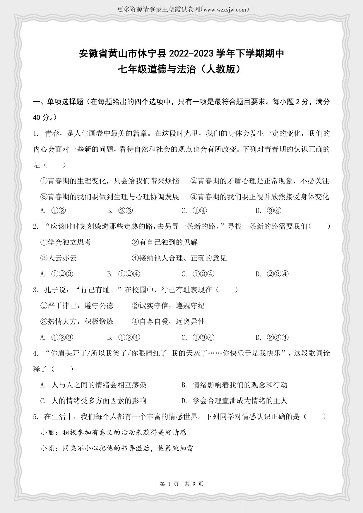 安徽省黄山市休宁县2022-2023学年下学期期中七年级道德与法治(人教版)