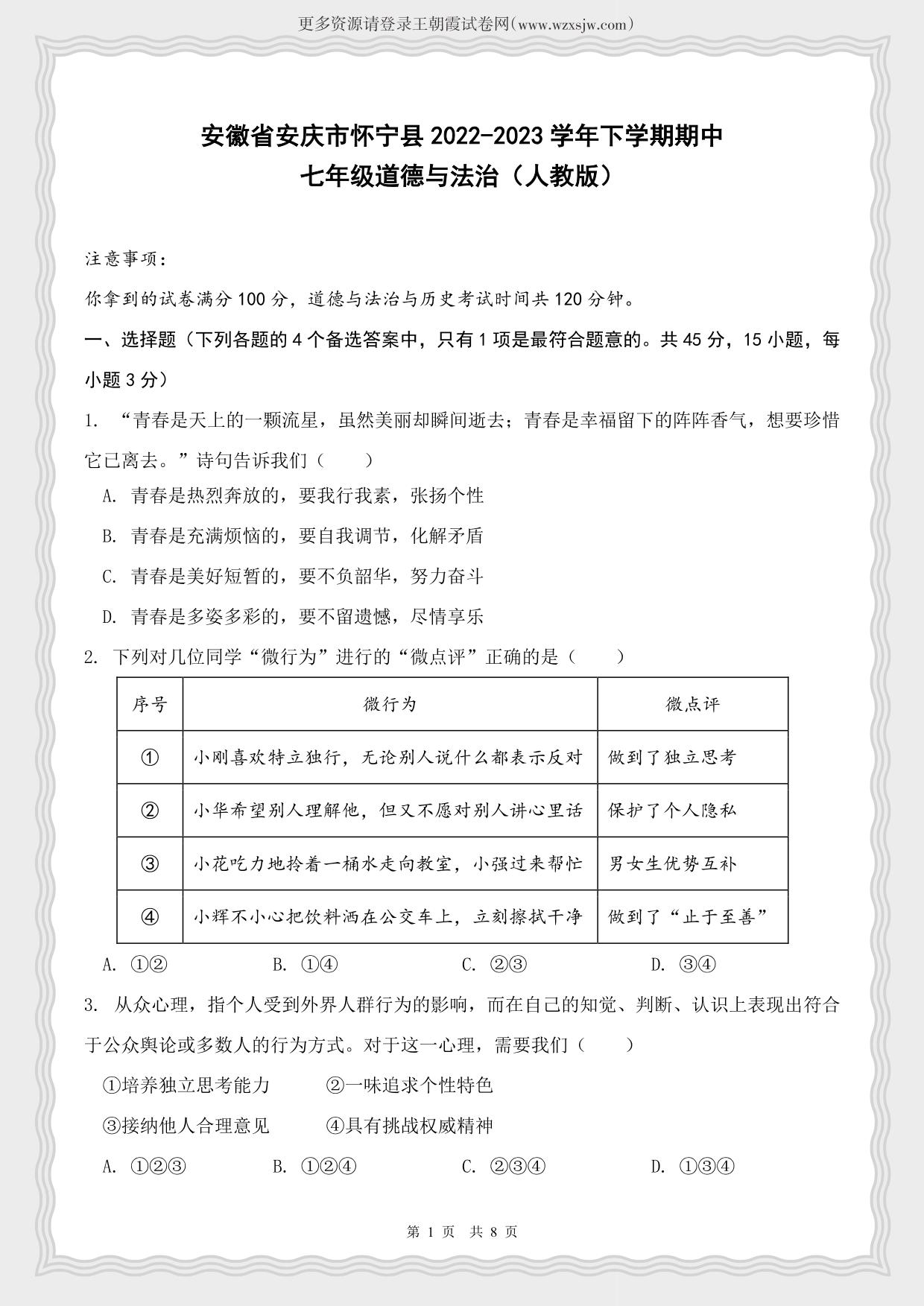 安徽省安庆市怀宁县2022-2023学年下学期期中七年级道德与法治(人教版)