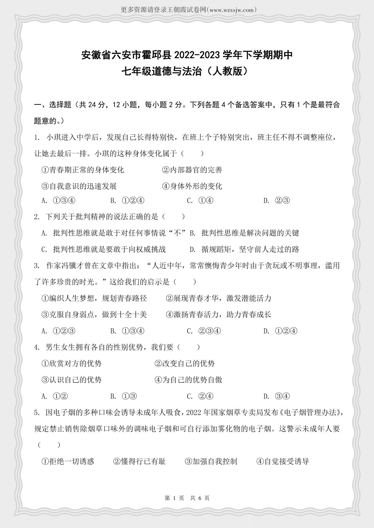 安徽省六安市霍邱县2022-2023学年下学期期中七年级道德与法治(人教版)