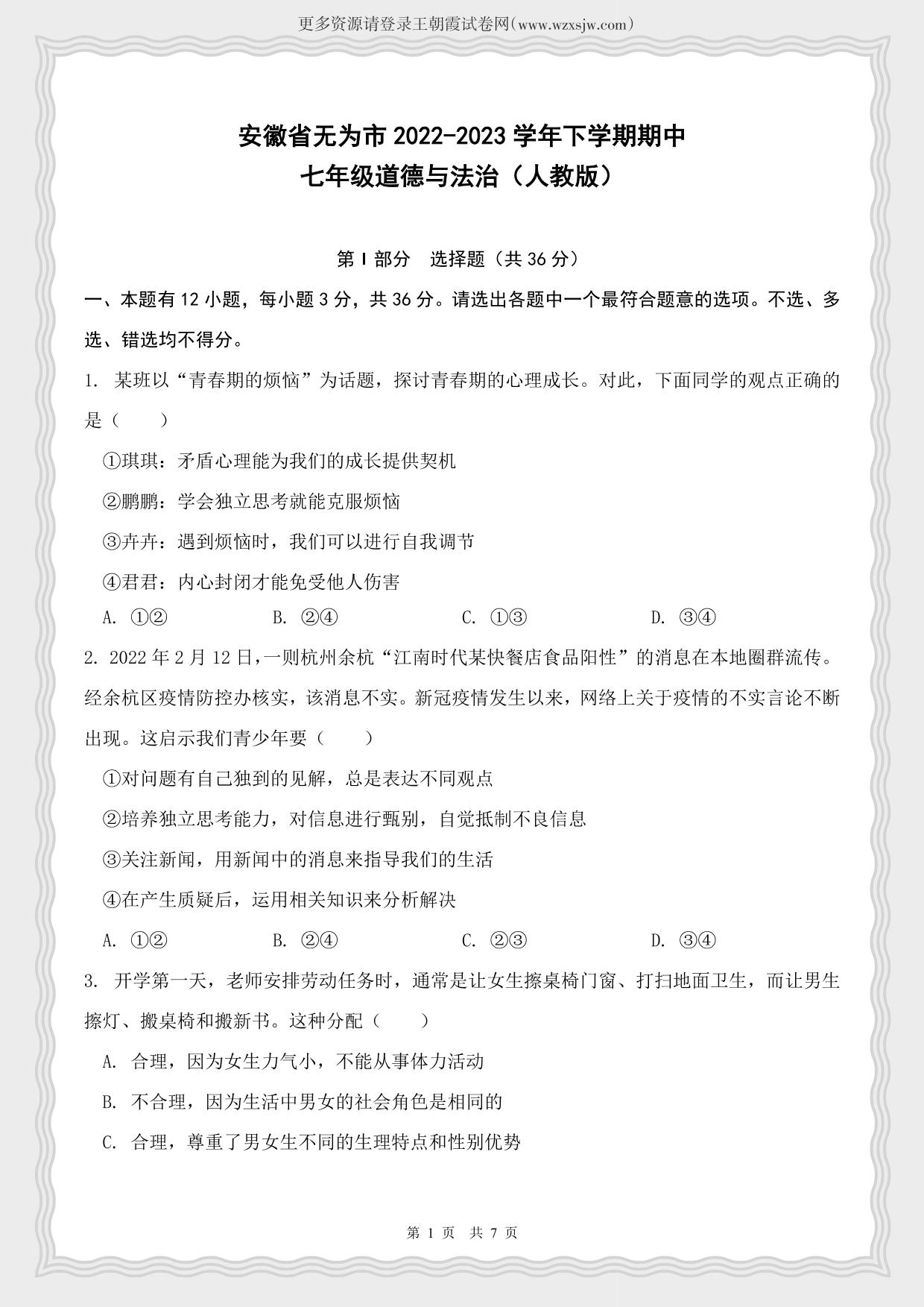 安徽省无为市2022-2023学年下学期期中七年级道德与法治(人教版)