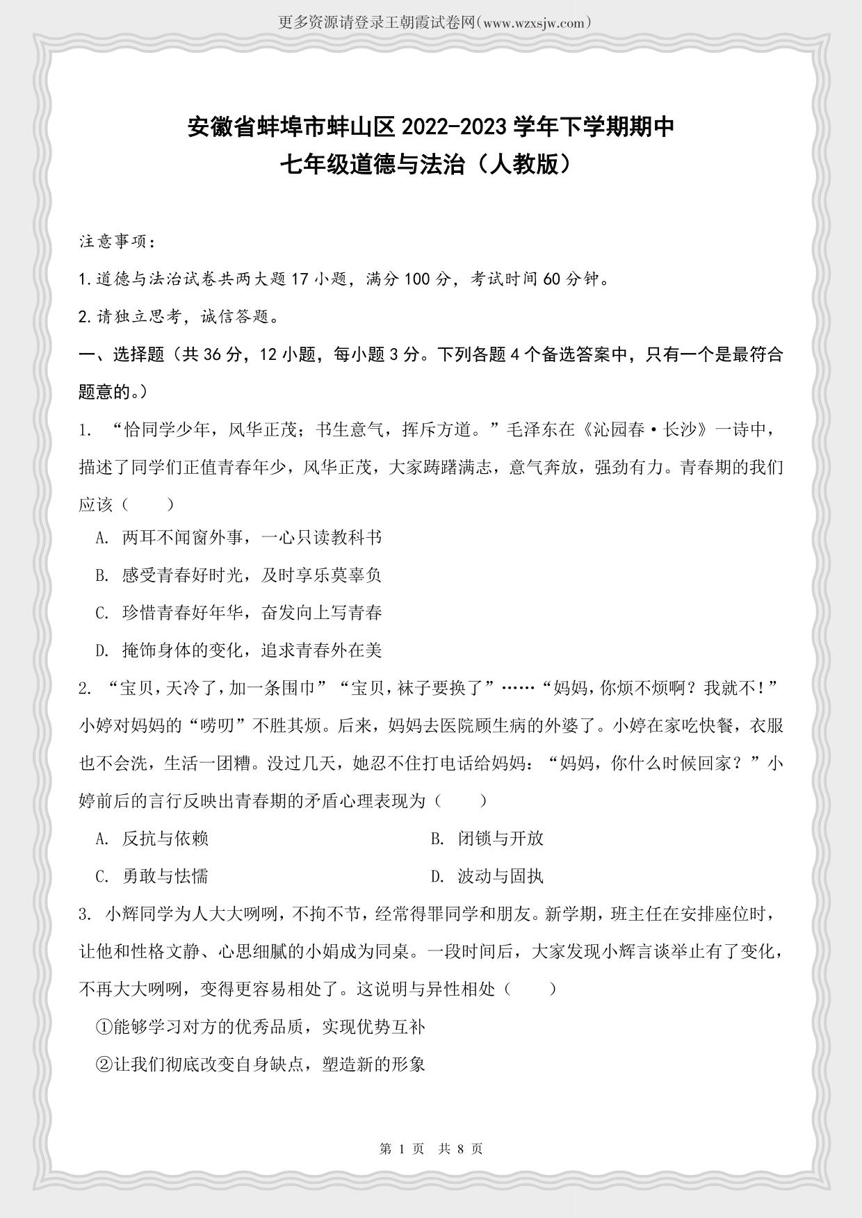 安徽省蚌埠市蚌山区2022-2023学年下学期期中七年级道德与法治(人教版)
