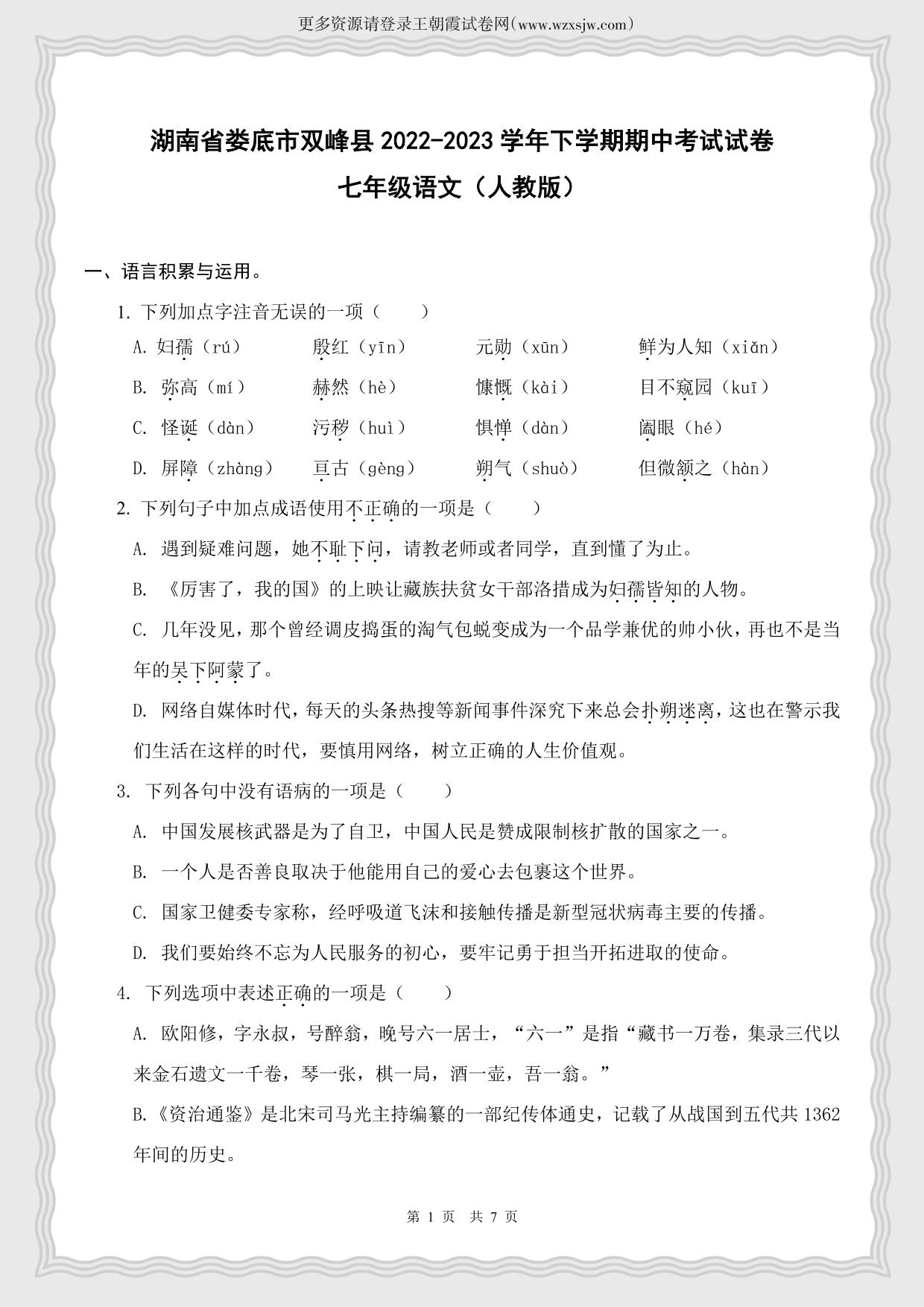 湖南省娄底市双峰县2022-2023学年下学期期中考试试卷七年级语文(人教版)