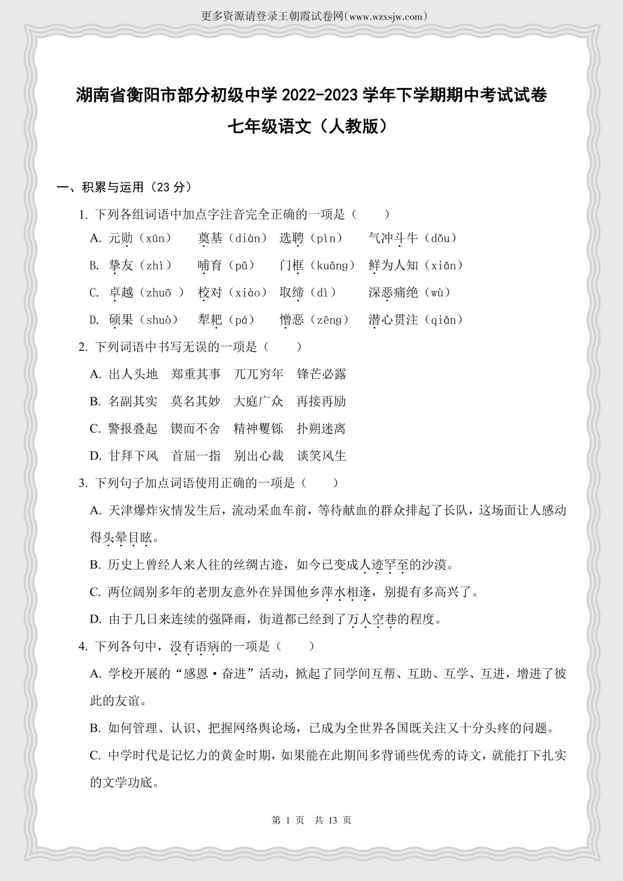 湖南省衡阳市部分初级中学2022-2023学年下学期期中考试试卷七年级语文(人教版)