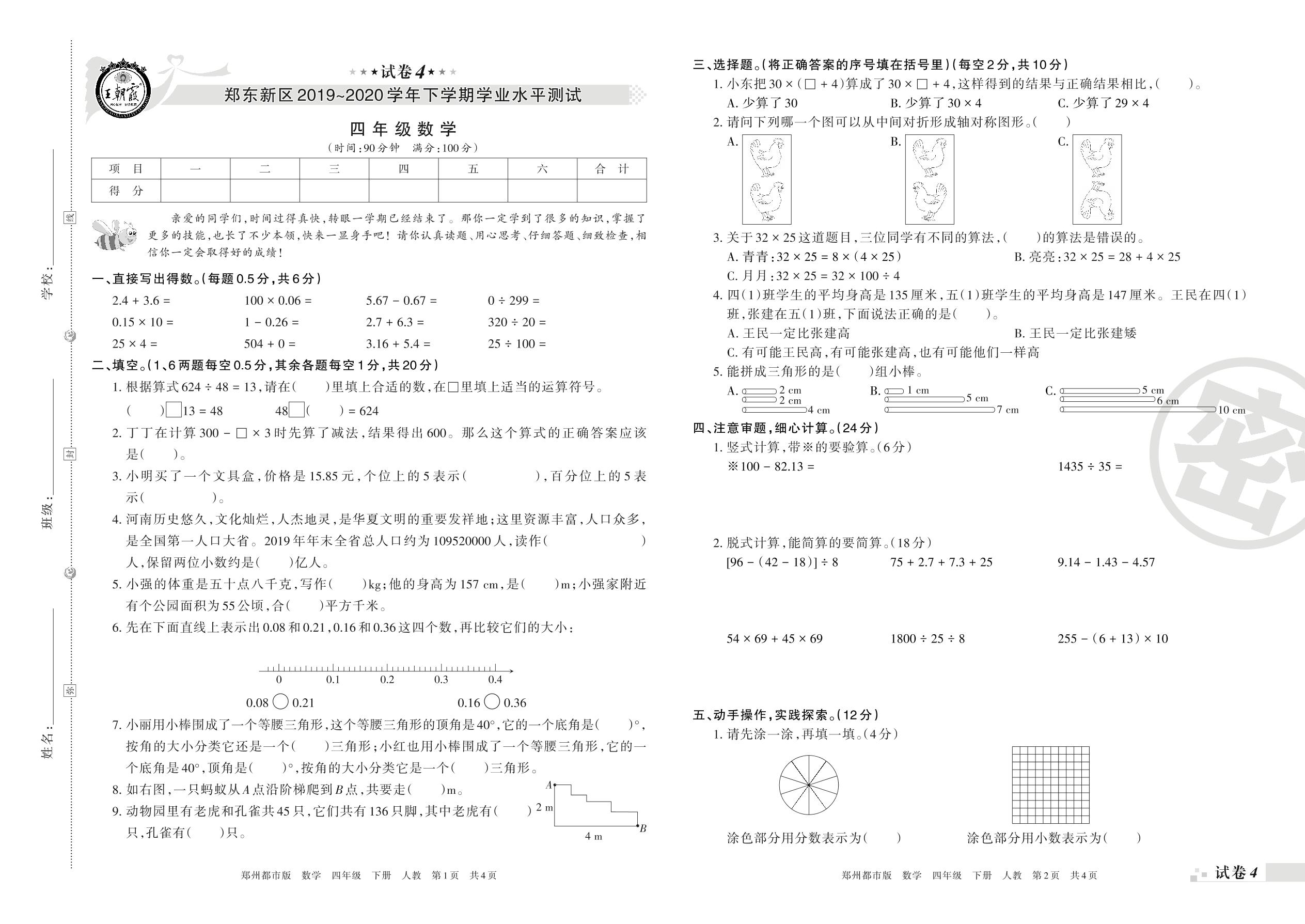 2019-2020学年第二学期郑州市郑东新区四年级数学试卷(人教版)【4】