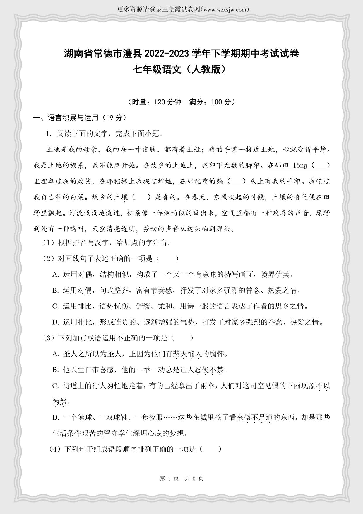 湖南省常德市澧县2022-2023学年下学期期中考试试卷七年级语文(人教版)