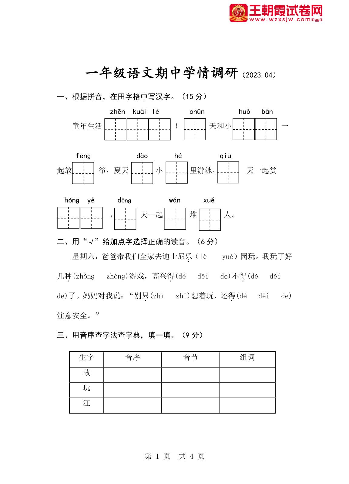 江苏省徐州市十校2022-2023学年下学期期中学情调研试卷一年级语文(人教版)