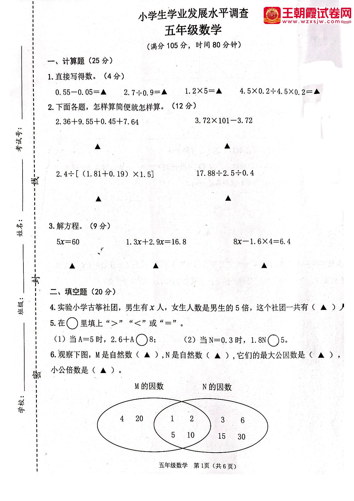 江苏省连云港市灌云县2022-2023学年下学期期中学业发展水平调查试卷五年级数学(苏教版)