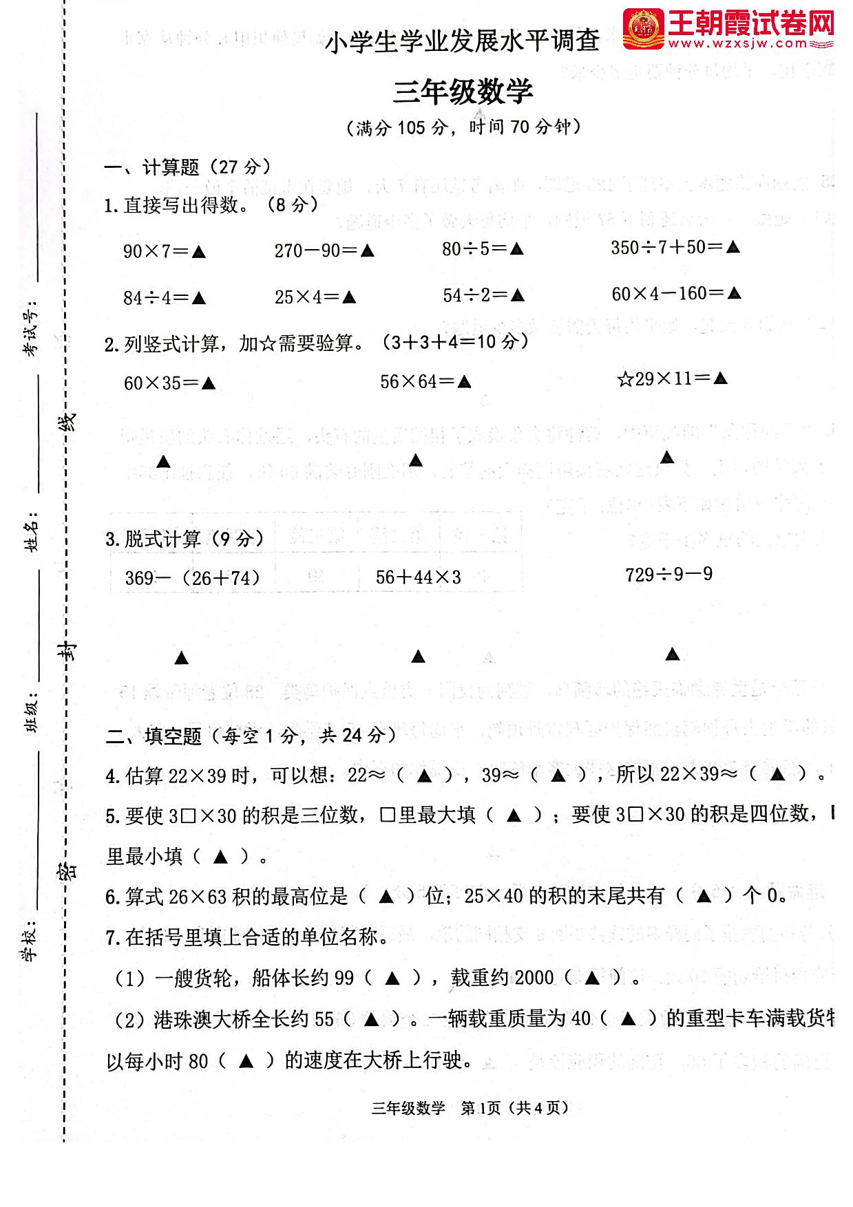 江苏省连云港市灌云县2022-2023学年第二学期期中学业发展水平调查试卷三年级数学(苏教版)