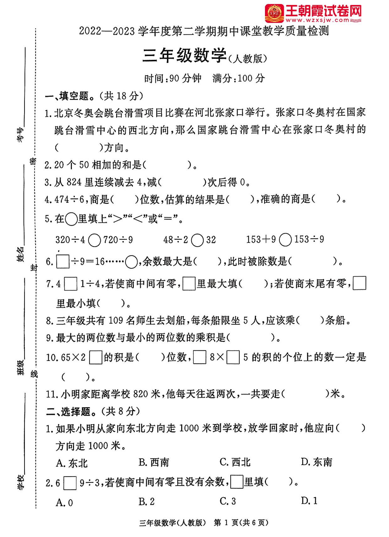 三年级数学人教版下册期中卷