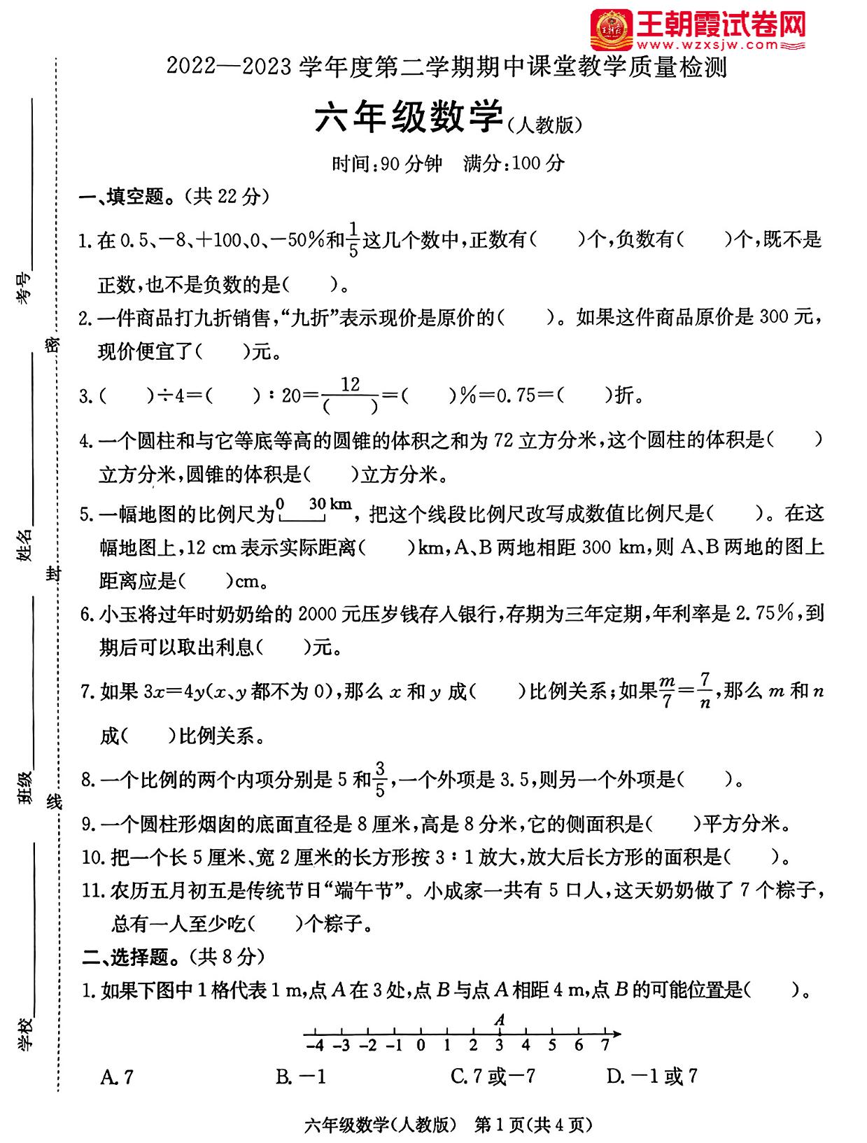 河北省廊坊市霸州市2022-2023学年度第二学期期中课堂教学质量检测六年级数学(人教版)